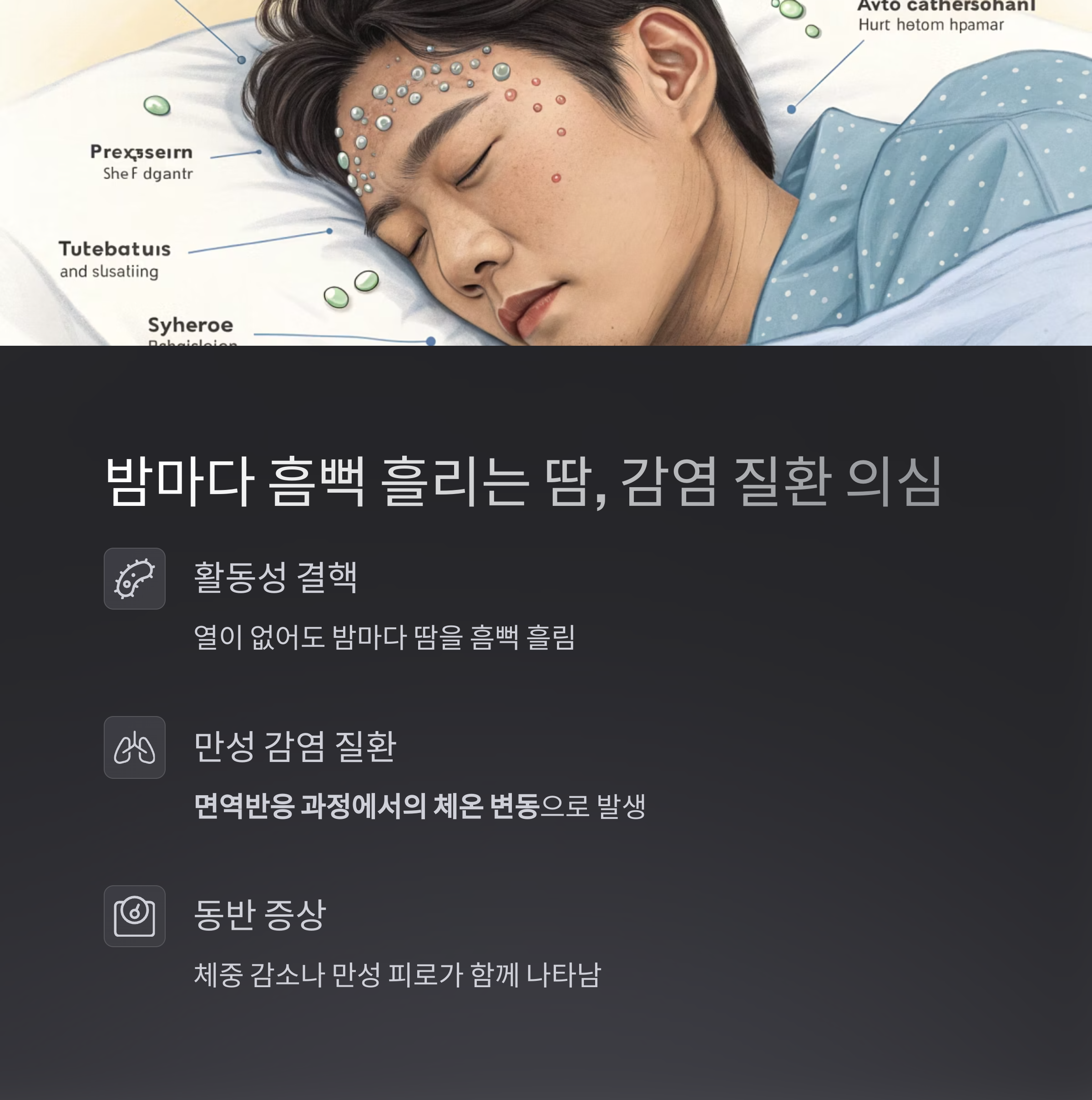 열이 없이도 갑자기 밤마다 땀을 흠뻑 흘린다면, 활동성 결핵이나 만성 감염 질환을 의심할 수 있습니다.