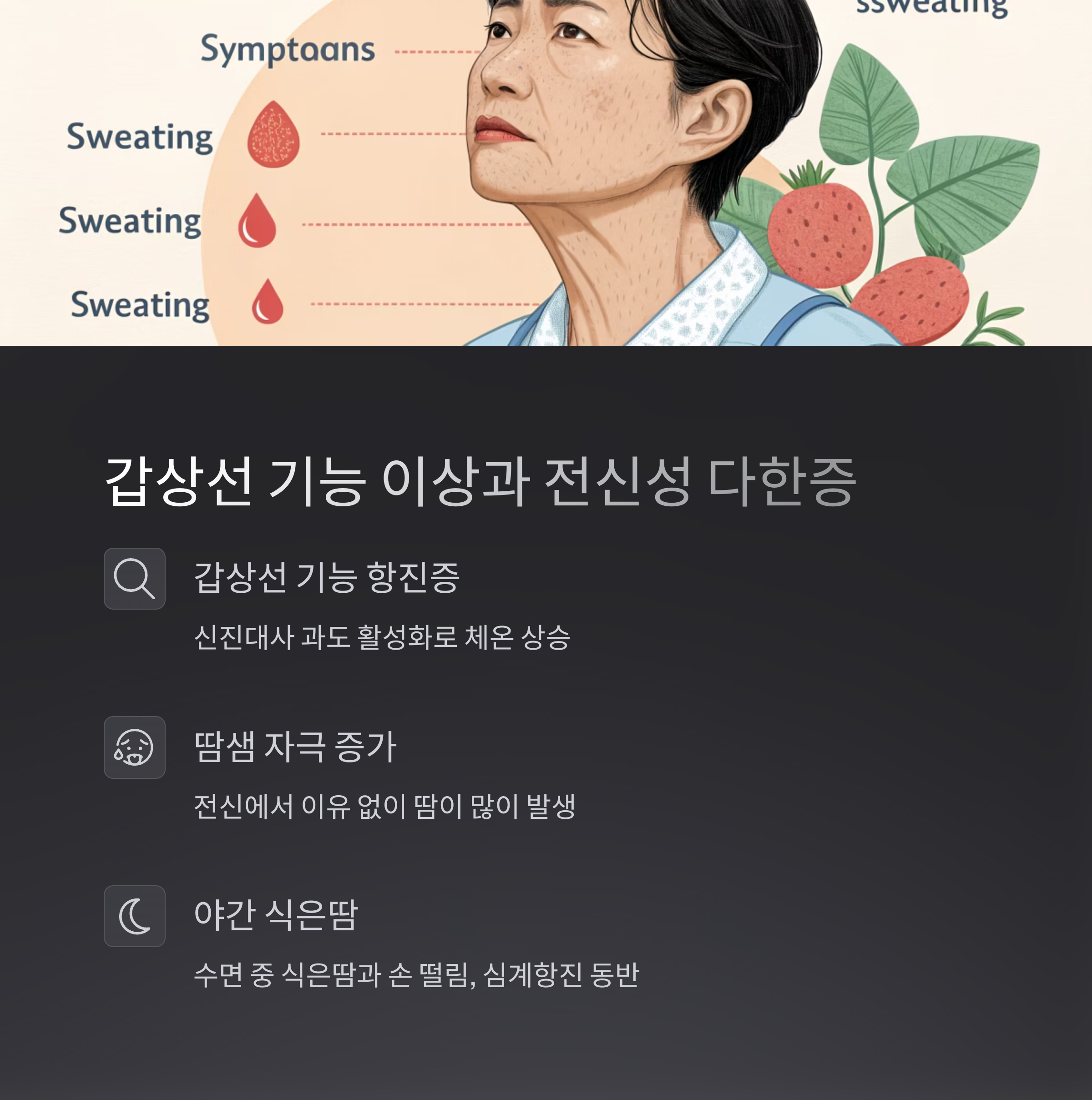 특히 밤에 잠을 자는 동안 식은땀이 자주 나고, 손 떨림, 심계항진 증상이 함께 나타난다면 반드시 내분비 검사를 받아야 합니다.
