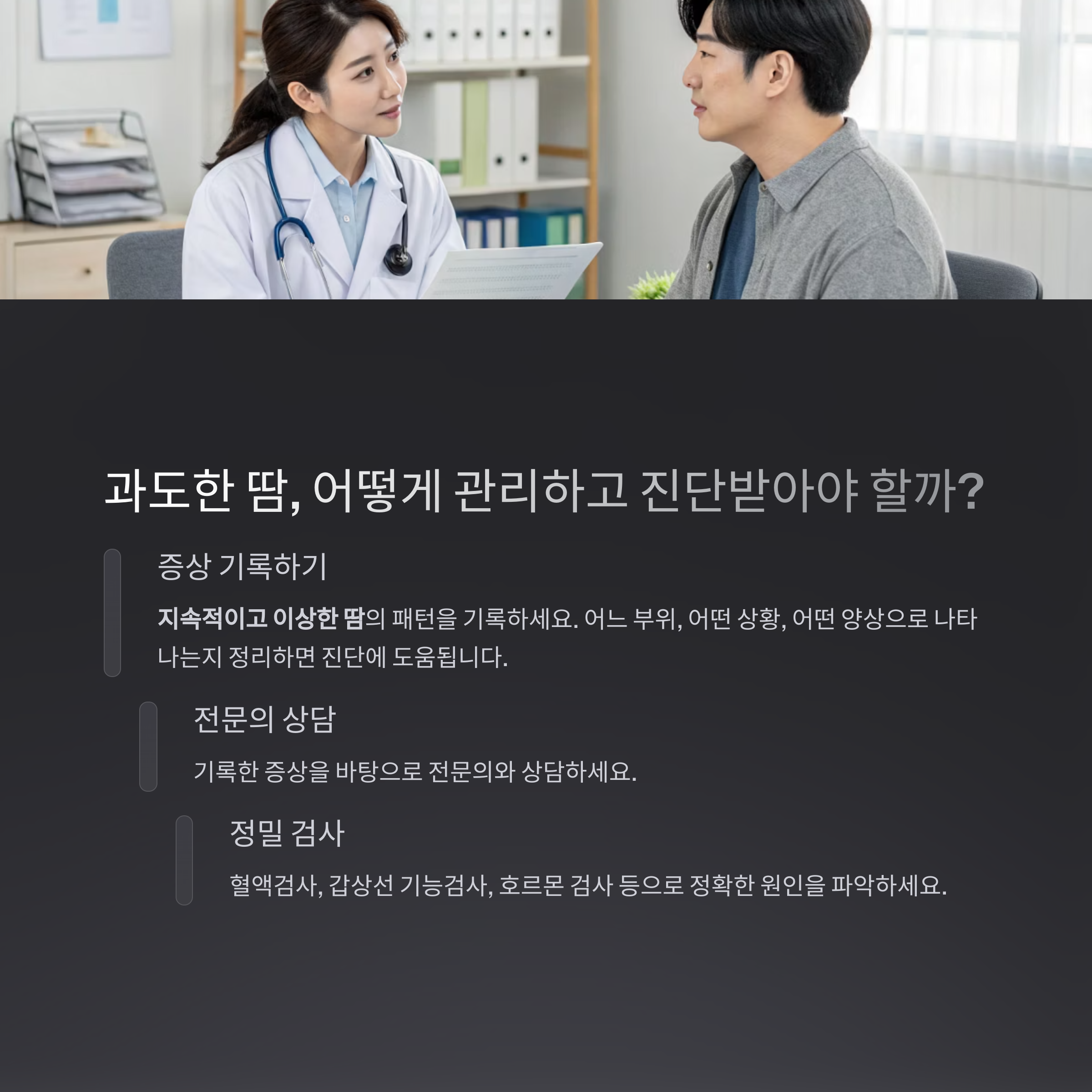 필요 시 혈액검사, 갑상선 기능검사, 호르몬 검사 등으로 정확한 원인을 파악해야 합니다.