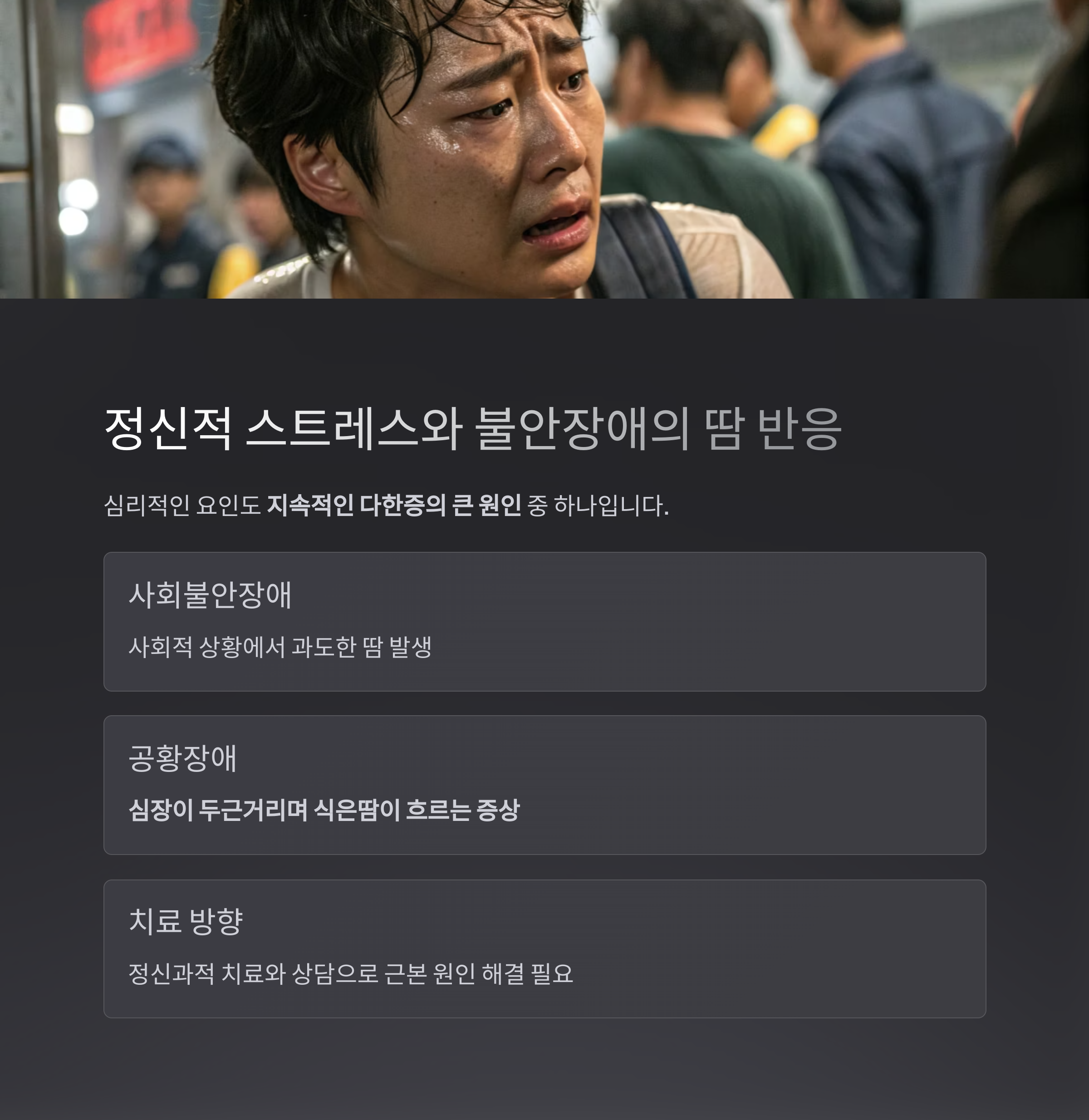 정신과적인 치료나 상담을 통해 근본 원인을 해결하지 않으면 땀 증상도 악화될 수 있습니다.