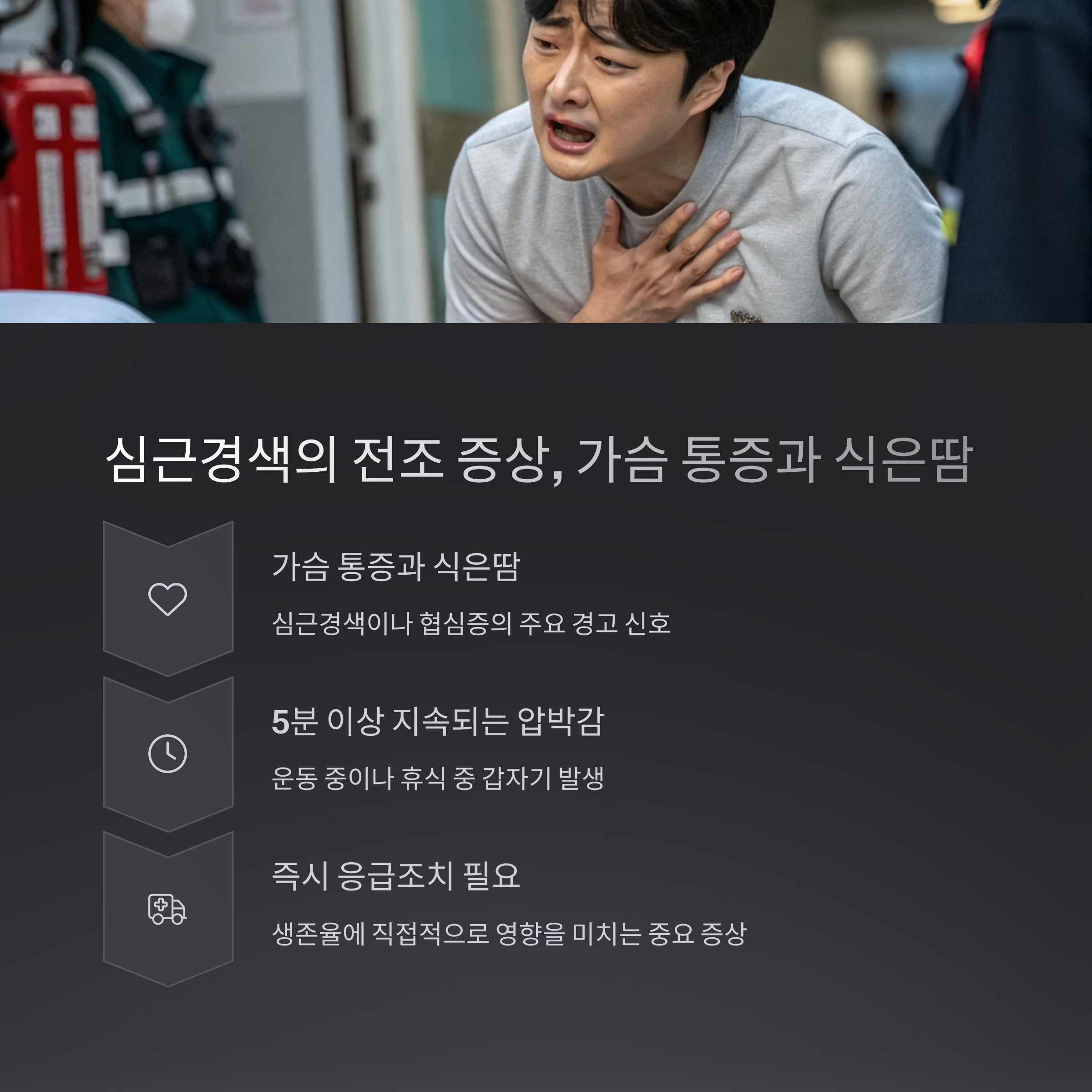 특히 운동 중이나 휴식 중 갑자기 땀이 흘러내리고 압박감 있는 통증이 5분 이상 지속된다면, 즉시 응급조치를 취해야 합니다.