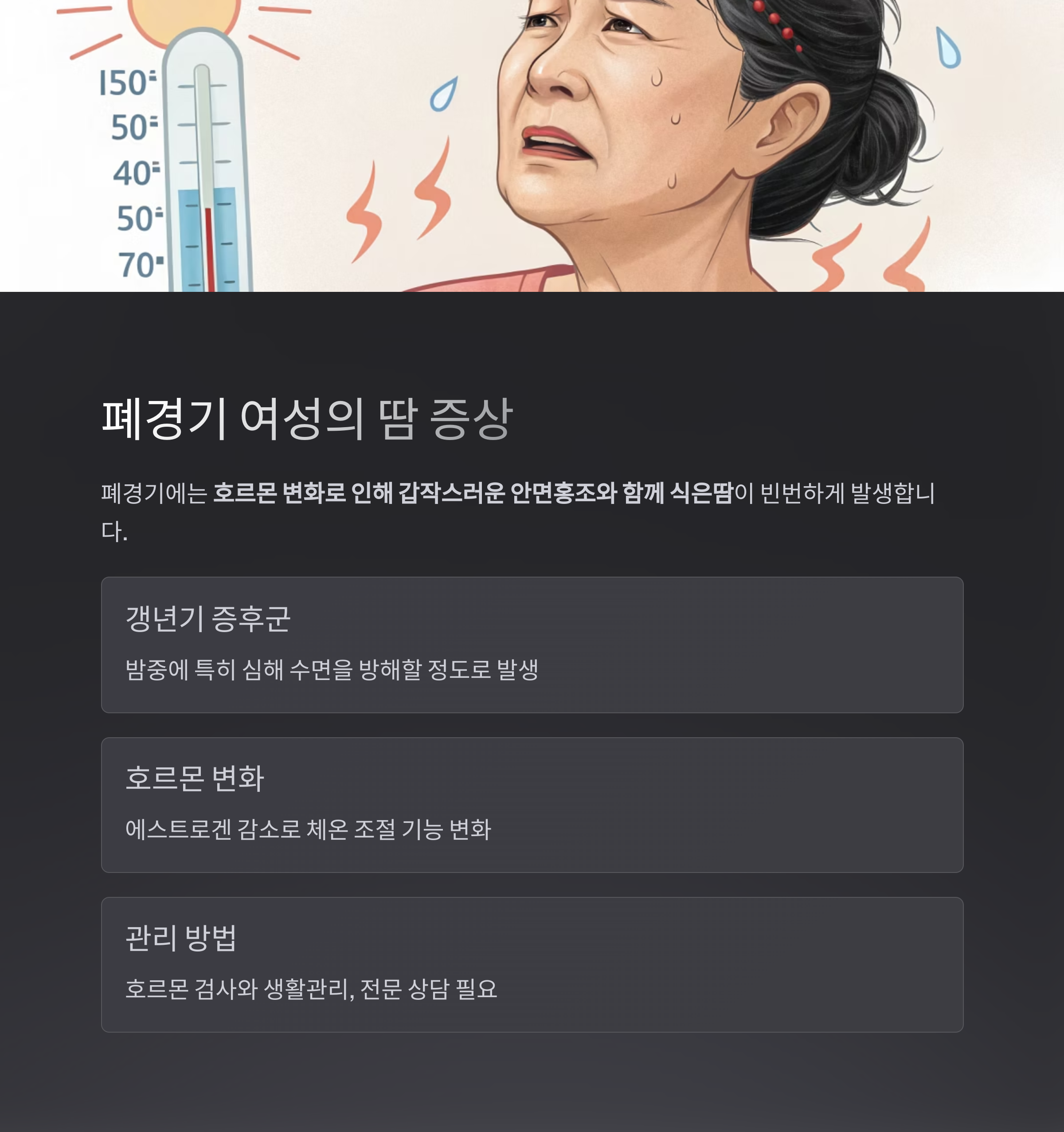 | 폐경 | 안면홍조, 야간 발한 | 50세 전후 여성, 생리 중단 |