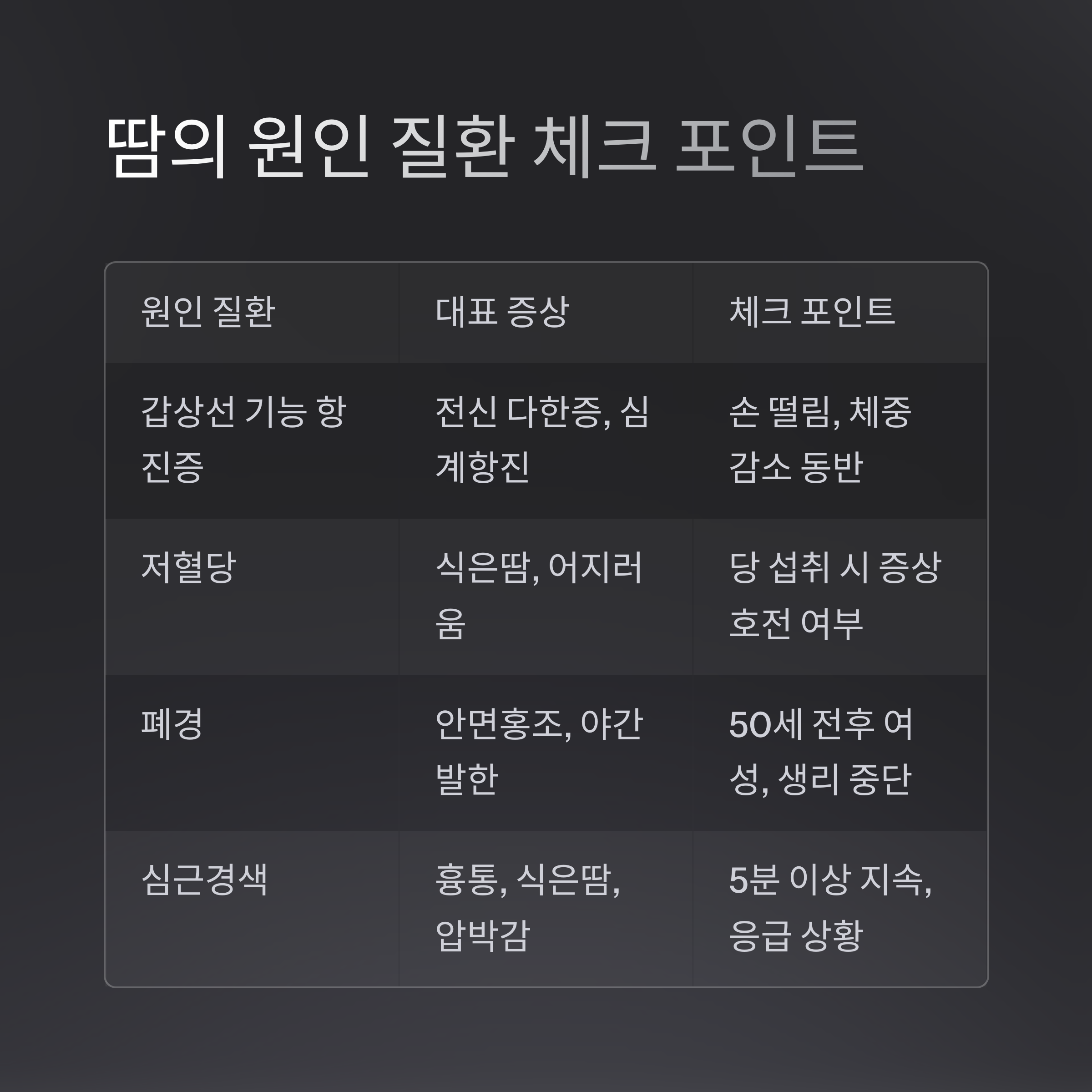 원인 질환 대표 증상 체크 포인트