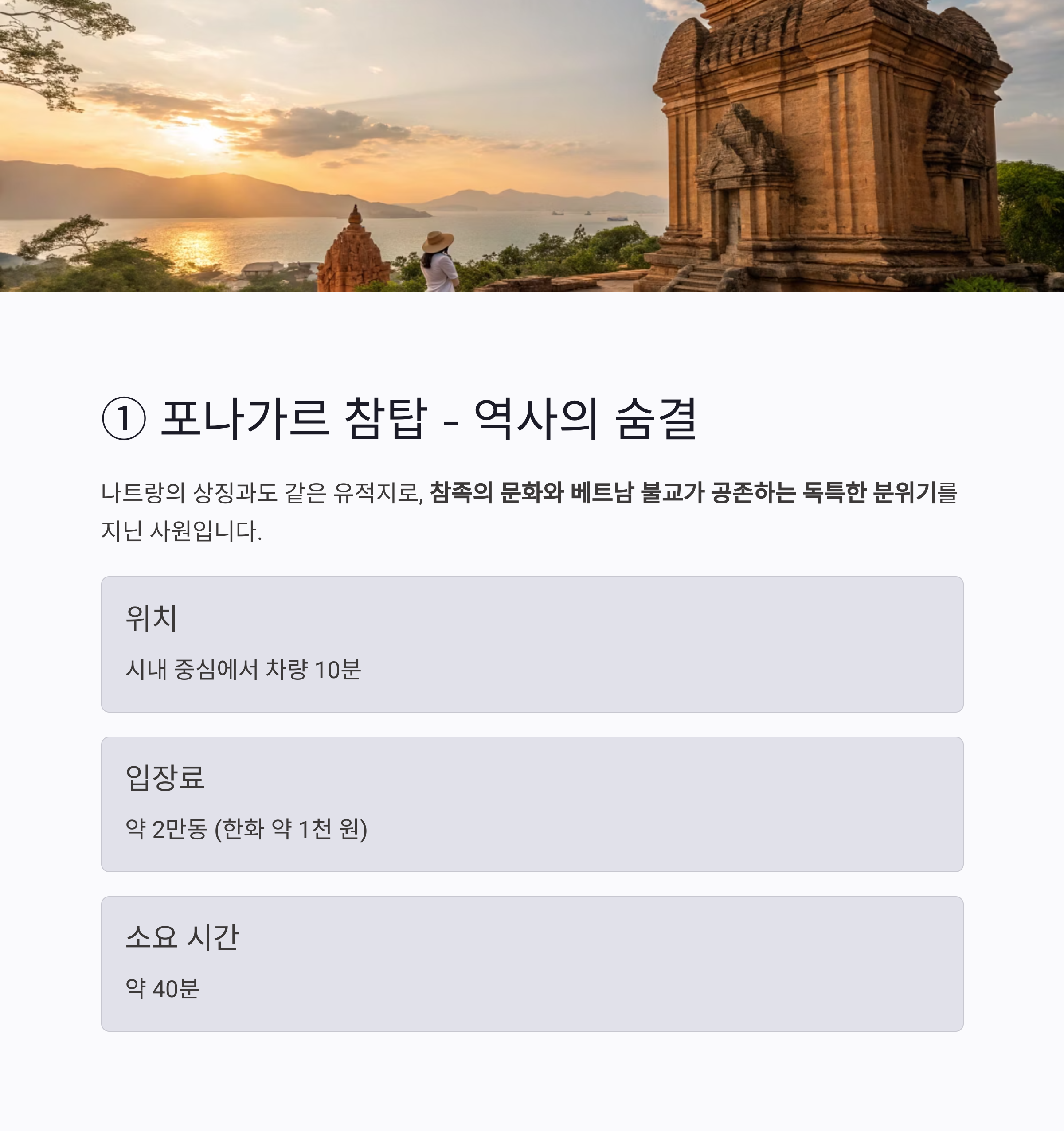 나트랑의 상징과도 같은 유적지로, 참족의 문화와 베트남 불교가 공존하는 독특한 분위기를 지닌 사원입니다.
