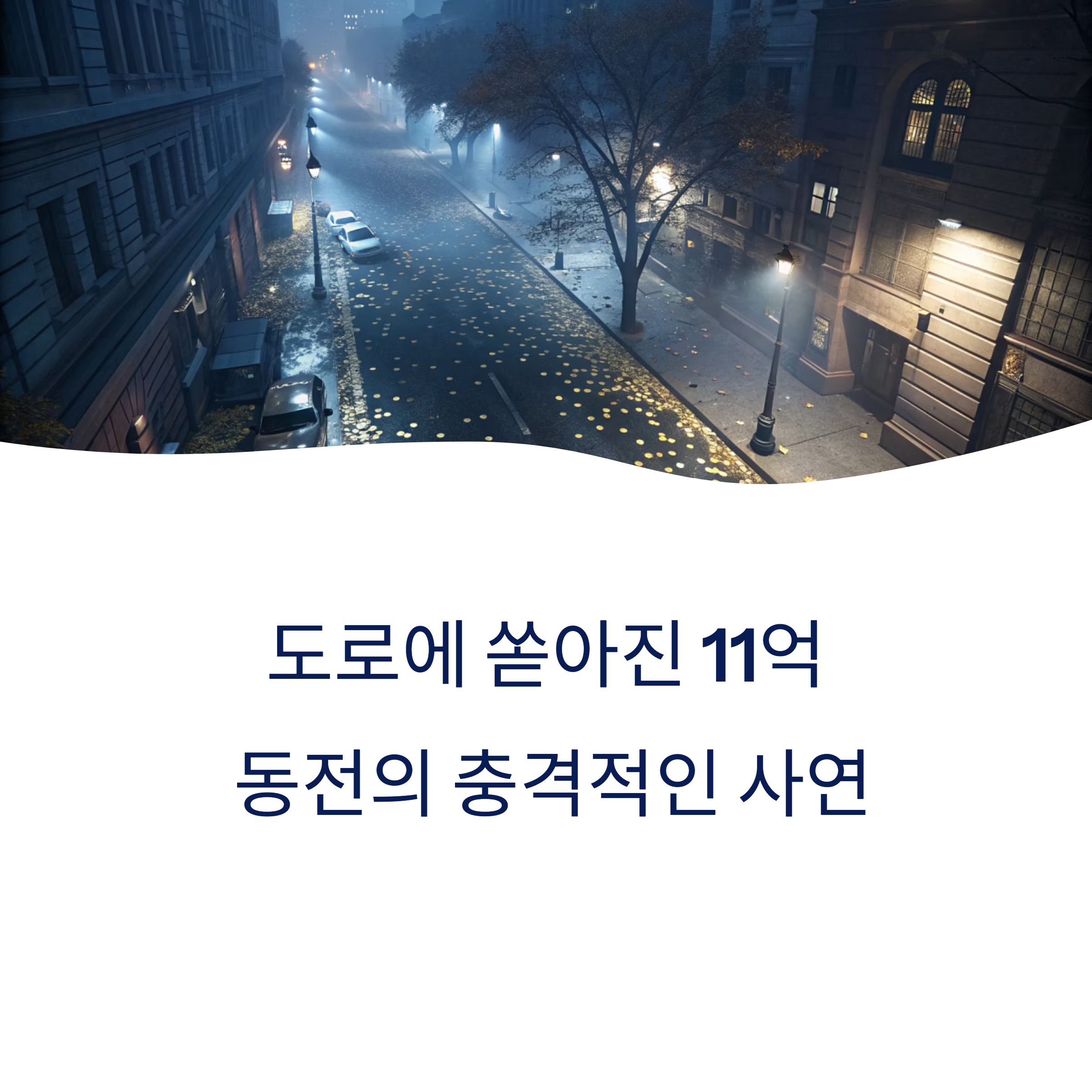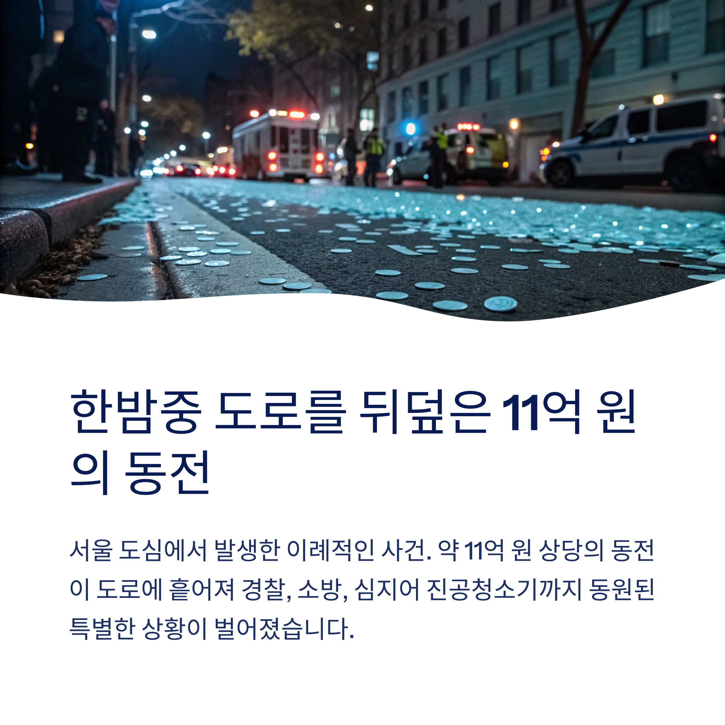 최근 한밤중 도심 도로에서 수십만 개의 동전이 쏟아져 내려 경찰과 소방, 그리고 진공청소기까지 동원된 이례적인 사건이 발생했습니다. 총액 약 11억 원 상당의 동전이 어떻게 도로 한복판에 흩어진 것일까요? 그 배경과 회수 과정을 따라가 봅니다.