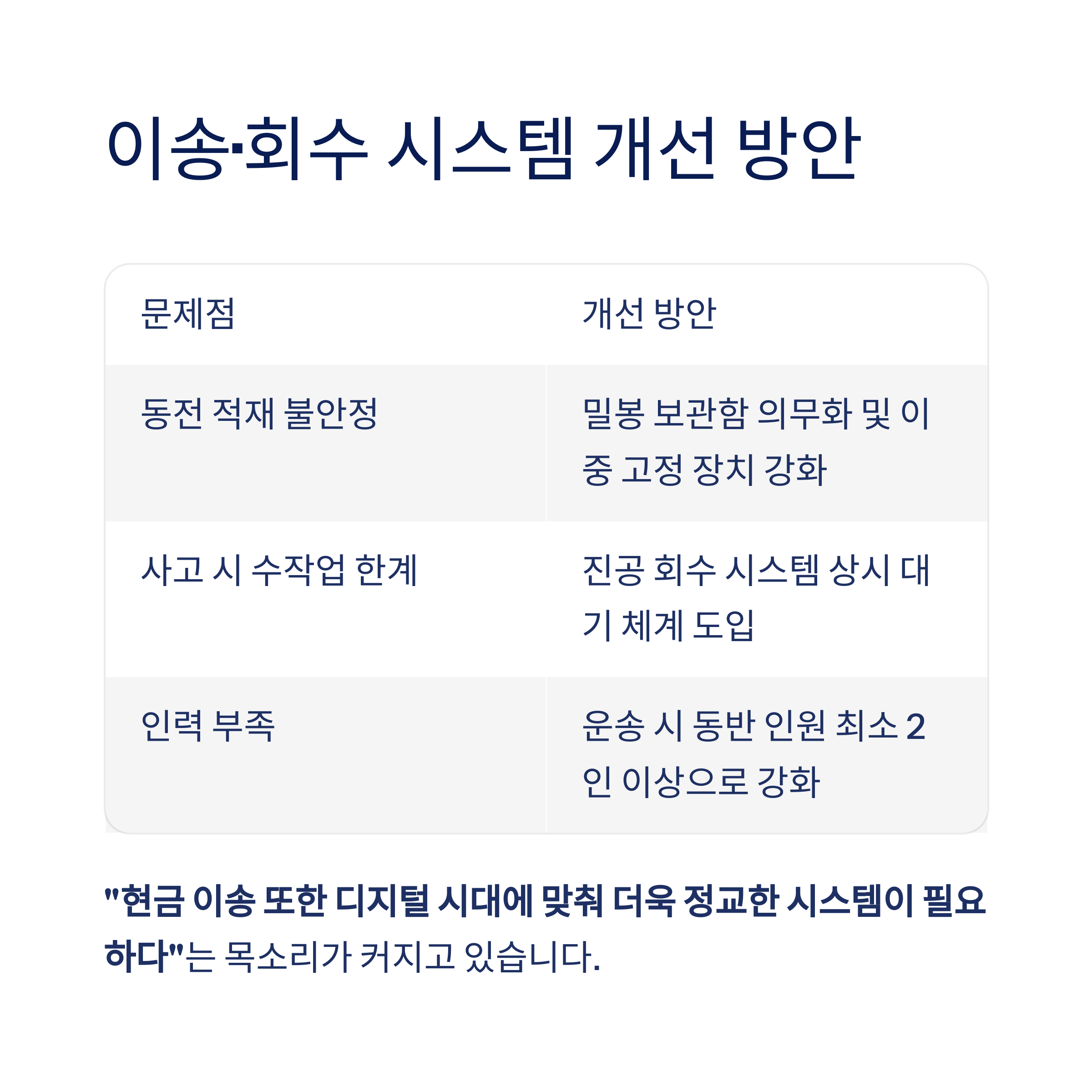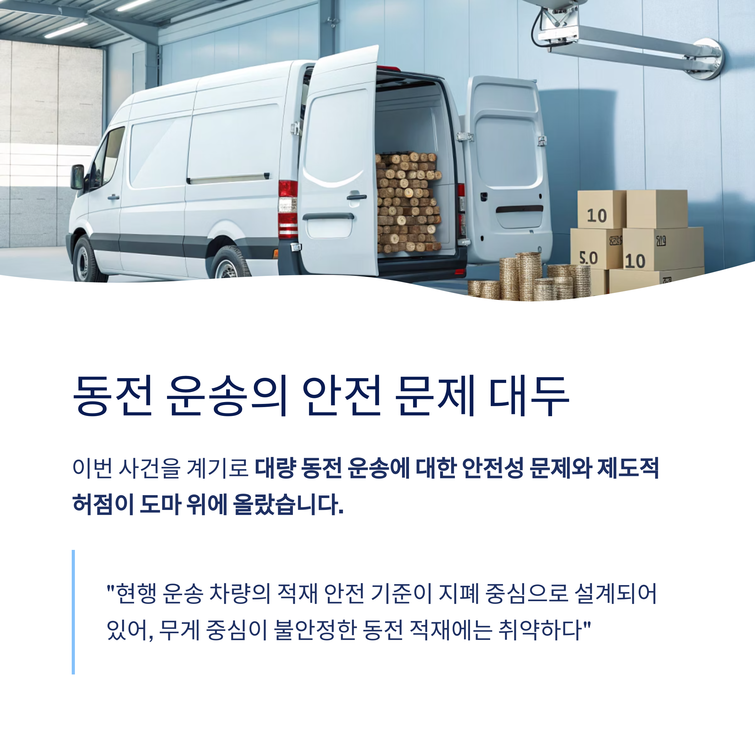 이번 사건을 계기로 대량 동전 운송에 대한 안전성 문제와 제도적 허점이 도마 위에 올랐습니다. 전문가들은 "현행 운송 차량의 적재 안전 기준이 지폐 중심으로 설계되어 있어, 무게 중심이 불안정한 동전 적재에는 취약하다"고 지적했습니다.