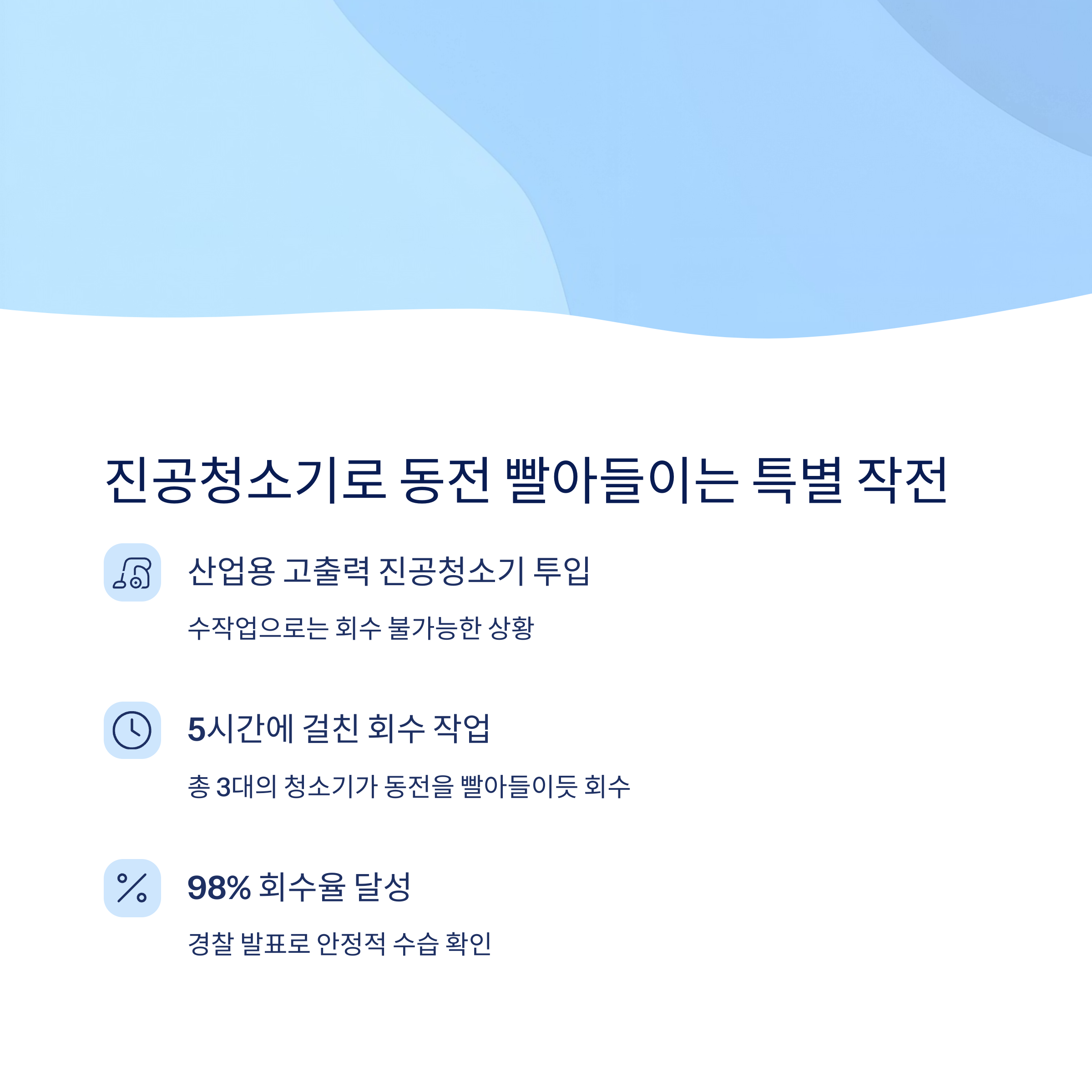 수백만 개에 달하는 동전 회수를 위해 현장에 긴급 투입된 것은 산업용 고출력 진공청소기였습니다. 수작업으로는 회수 불가능한 상황에서 총 3대의 청소기가 투입돼 약 5시간에 걸쳐 동전을 빨아들이듯 회수했습니다. 이후 경찰은 "회수율 약 98%"라며 안정적인 수습이 이루어졌다고 밝혔습니다.