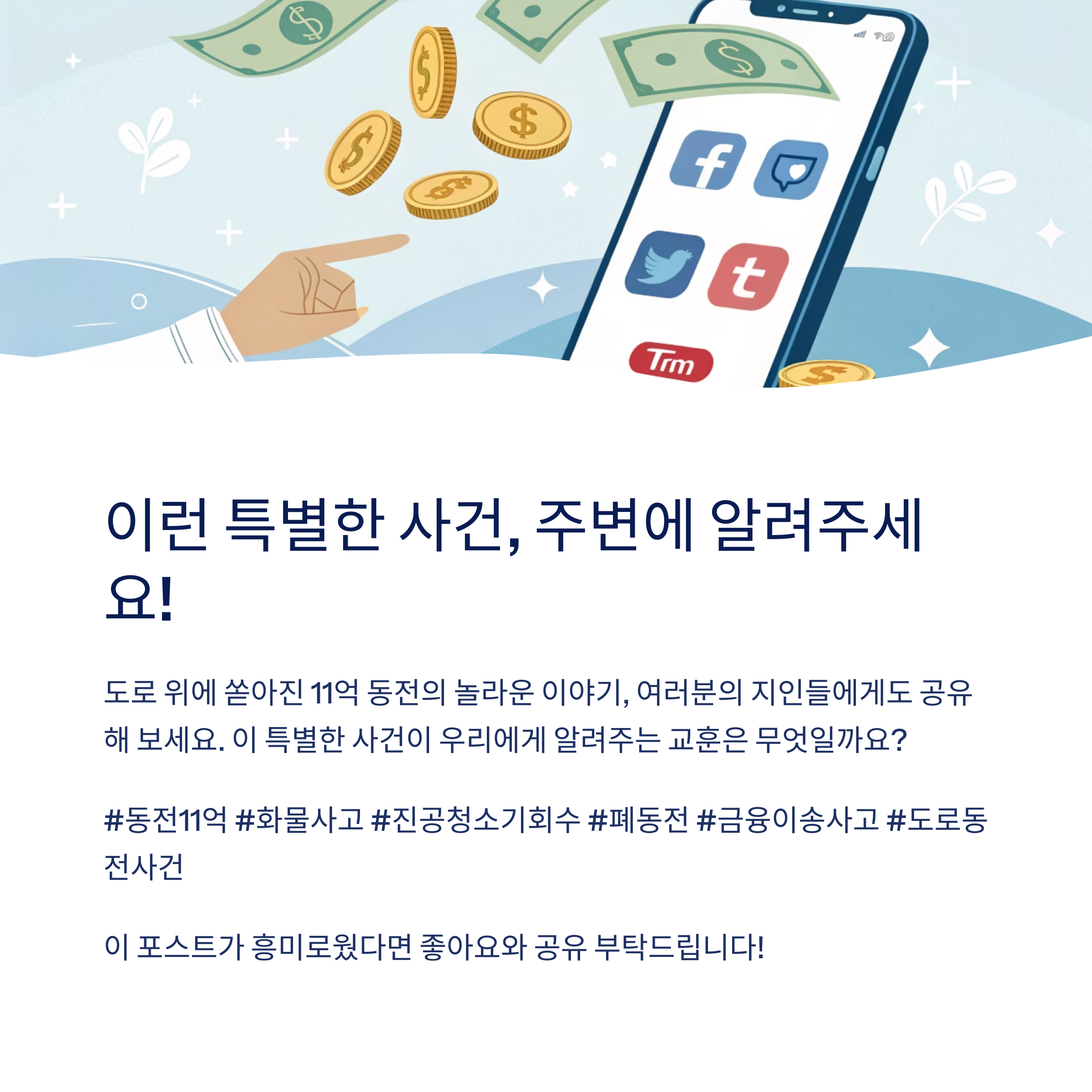 이번 사건은 단순한 사고를 넘어 금융 물류 체계의 보안성과 현실을 되짚게 한 계기가 되었습니다. 도로를 뒤덮은 11억 동전과 이를 빨아들인 진공청소기의 모습은, 지금도 많은 이들에게 충격적인 장면으로 회자되고 있습니다.
