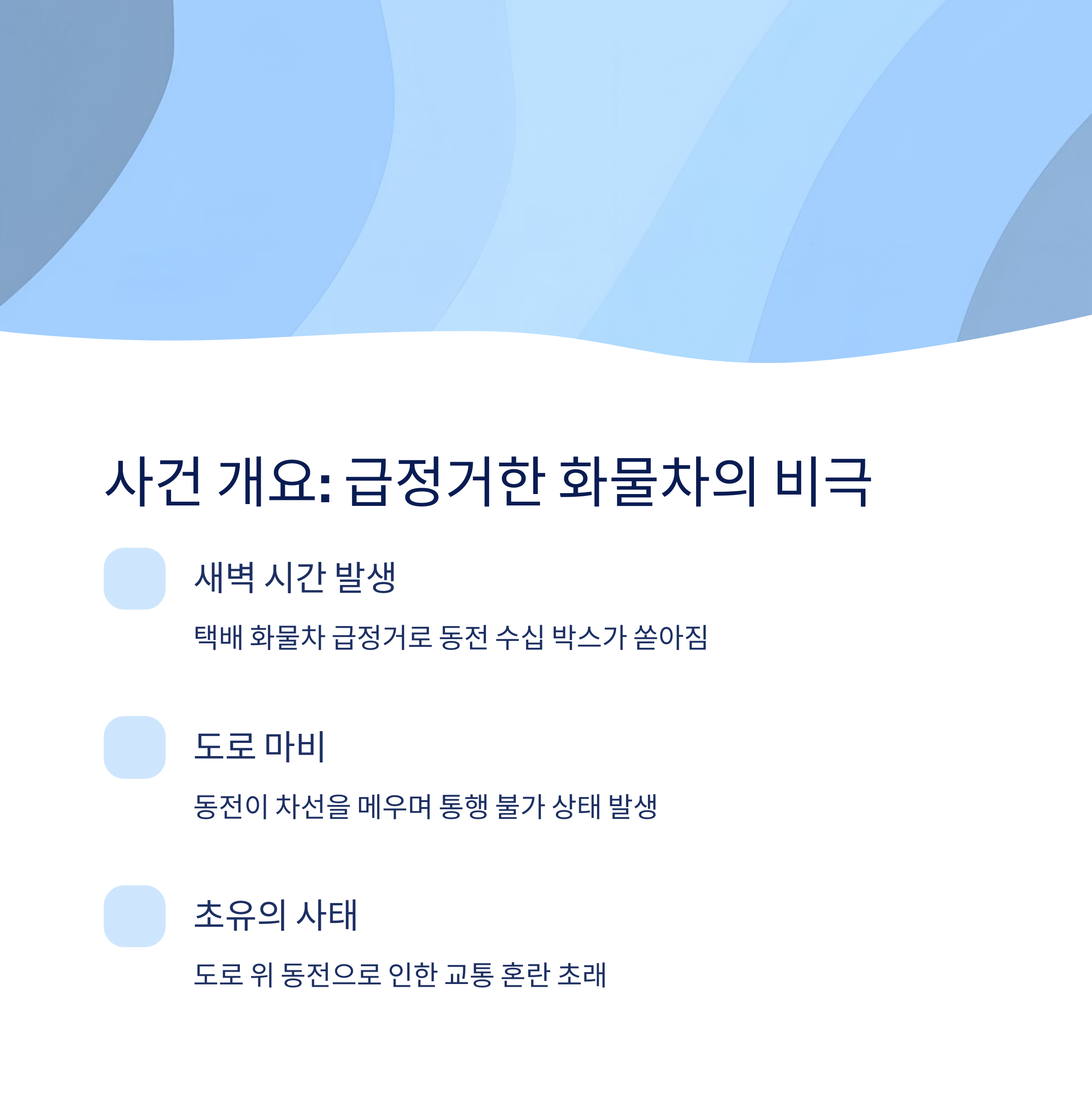사건은 서울 도심의 한 도로에서 발생했습니다. 새벽 시간, 택배 화물차 한 대가 급정거하면서 적재함에 실려 있던 동전 수십 박스가 한꺼번에 쏟아졌고, 이 중 상당량이 차선 곳곳에 흩어졌습니다. 사고 직후 동전이 도로를 메우며 차량 통행이 마비되는 초유의 사태가 벌어졌습니다.