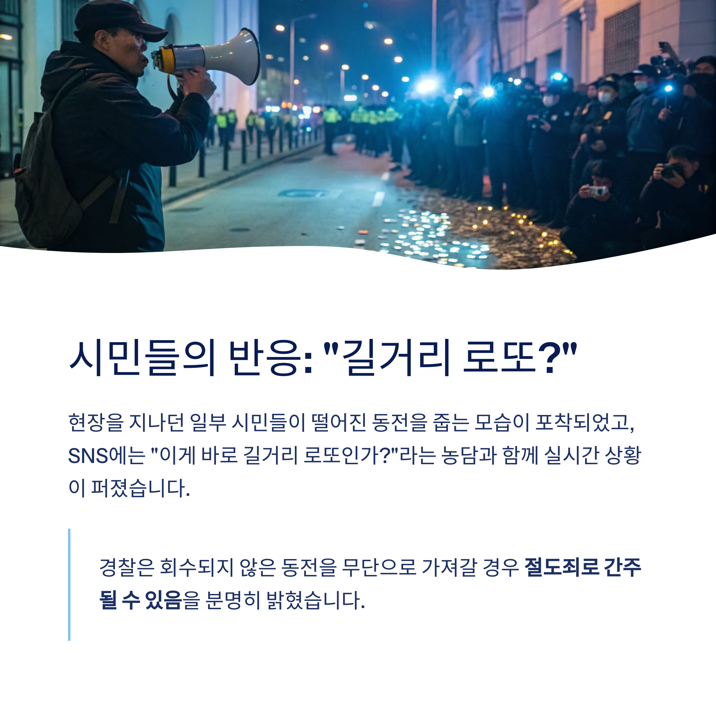 현장을 지나던 일부 시민들이 떨어진 동전을 줍는 모습이 포착되었고, SNS에는 “이게 바로 길거리 로또인가?”라는 농담과 함께 실시간 상황이 퍼졌습니다. 그러나 경찰은 회수되지 않은 동전을 무단으로 가져갈 경우 절도죄로 간주될 수 있음을 분명히 밝혔습니다.