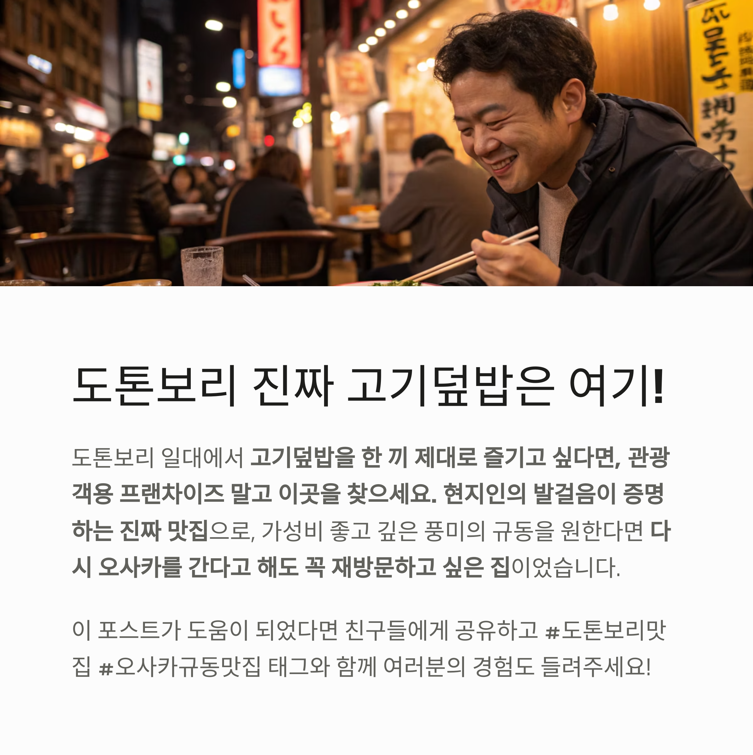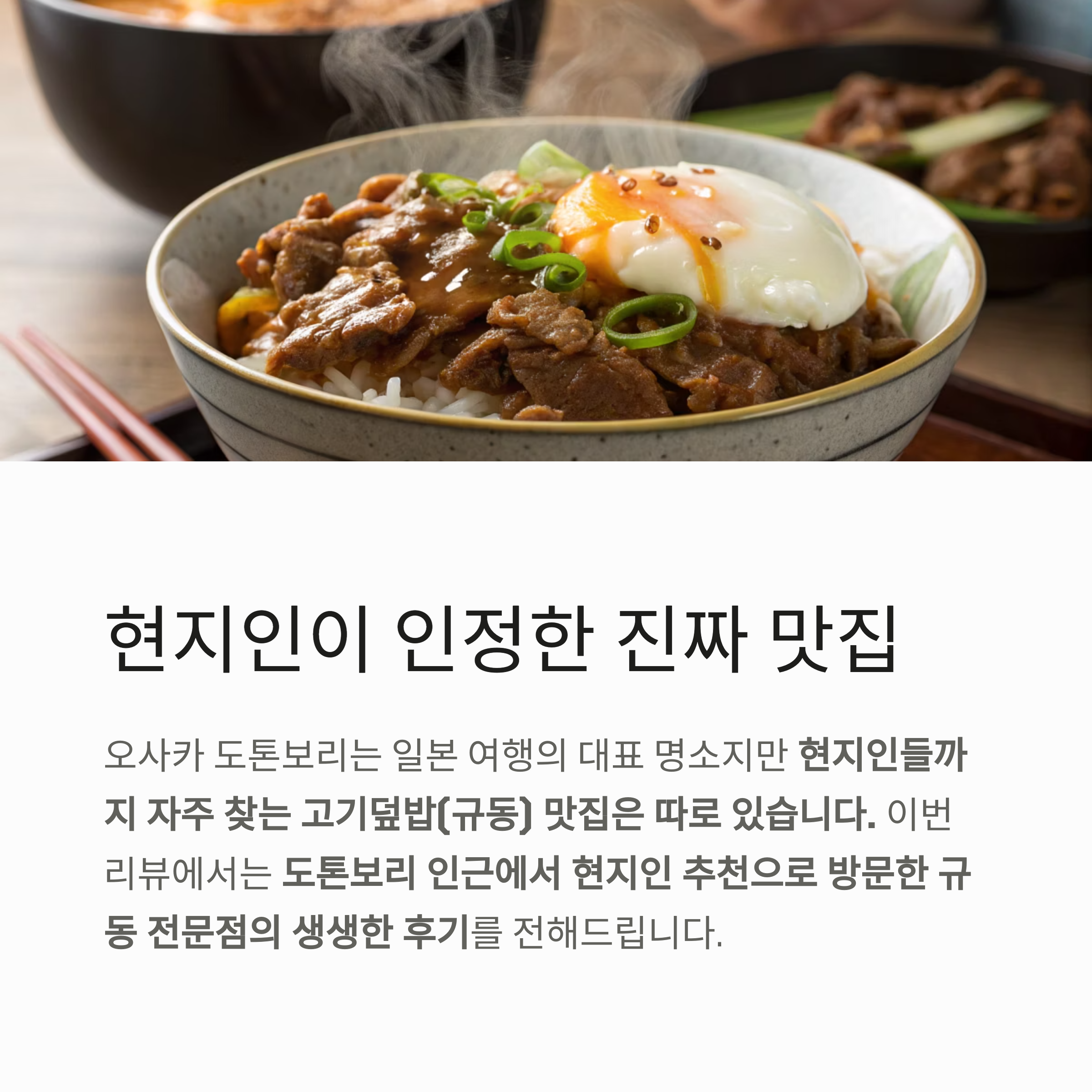이번 리뷰에서는 도톤보리 인근에서 현지인 추천으로 방문한 규동 전문점의 생생한 후기를 전해드립니다.