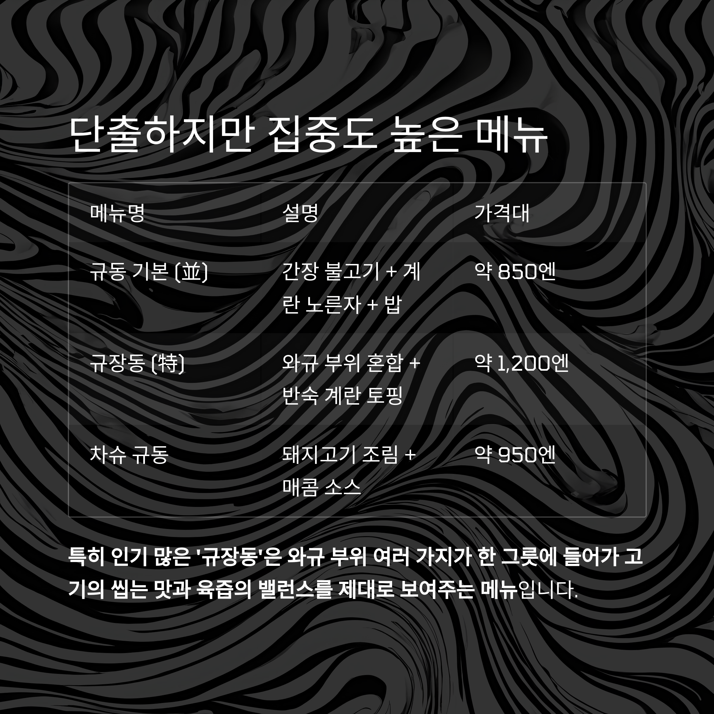 | 규장동 (特) | 와규 부위 혼합 + 반숙 계란 토핑 | 약 1,200엔 |
