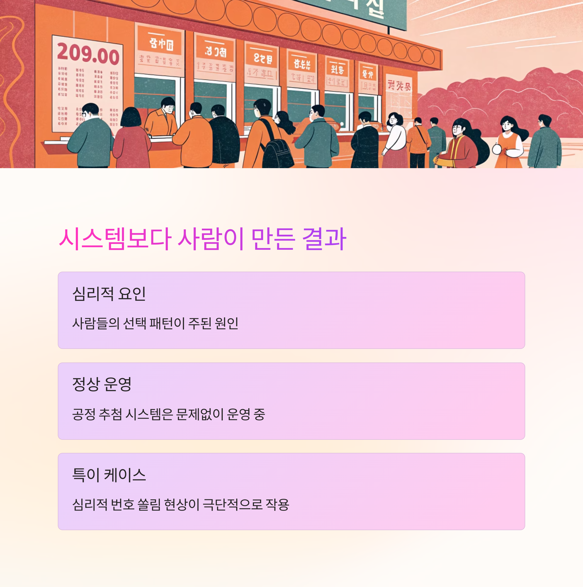 1등 당첨자 수가 급증한 이유는 시스템 오류보다 사람들의 선택 패턴에 기인한 것이라는 것이 전문가들의 공통된 분석입니다. 공정 추첨 시스템은 문제없이 운영 중이며, "심리적 번호 쏠림 현상이 극단적으로 작용한 특이 케이스"로 보는 것이 타당합니다.