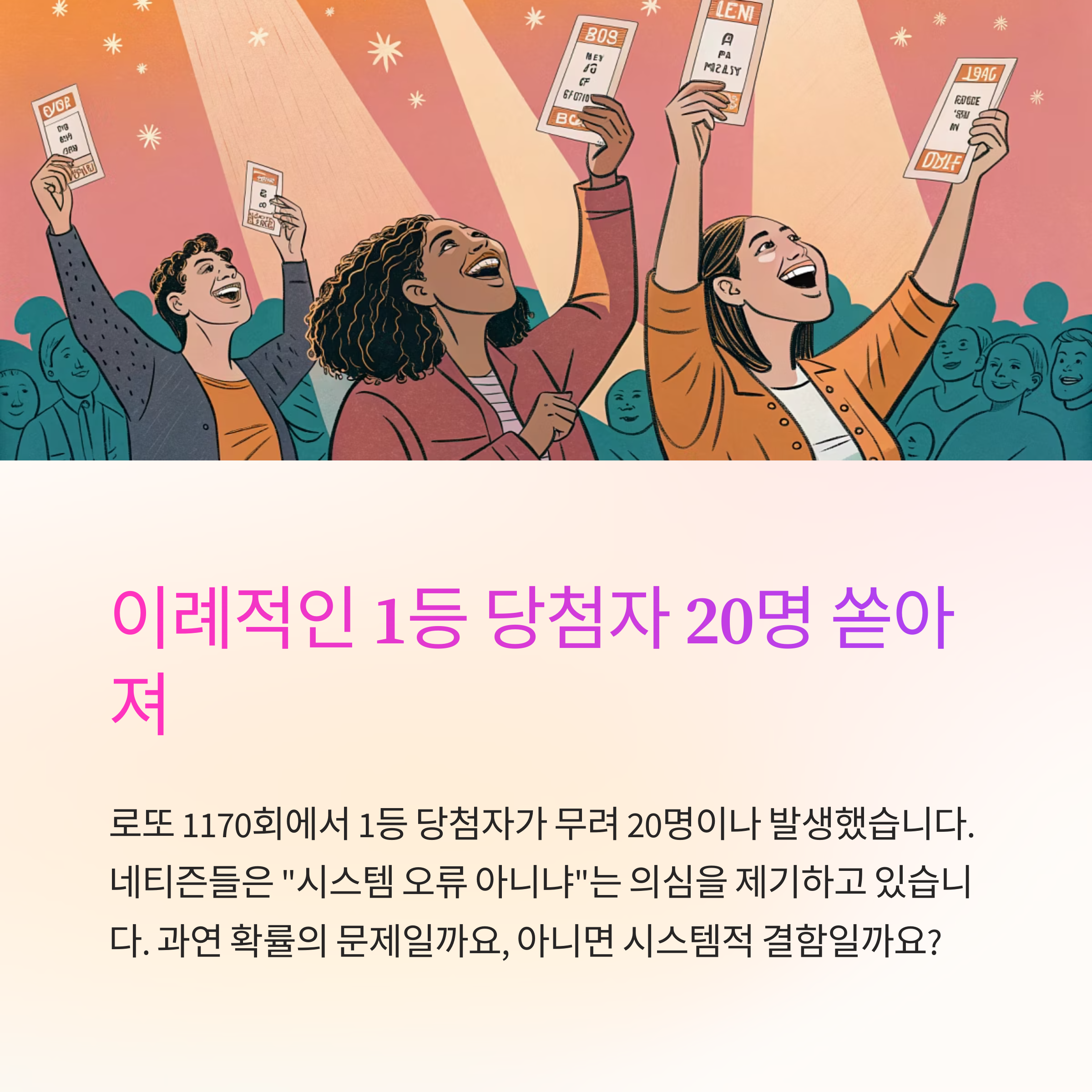 로또 1170회에서는 1등 당첨자만 무려 20명이 쏟아졌습니다. 이례적인 결과에 대해 네티즌 사이에서는 “시스템 오류 아니냐”는 의심이 제기되고 있는데요. 과연 이같은 현상이 단순 확률의 문제인지, 아니면 시스템적 결함의 가능성이 있는지 전문가들의 분석을 종합해보았습니다.