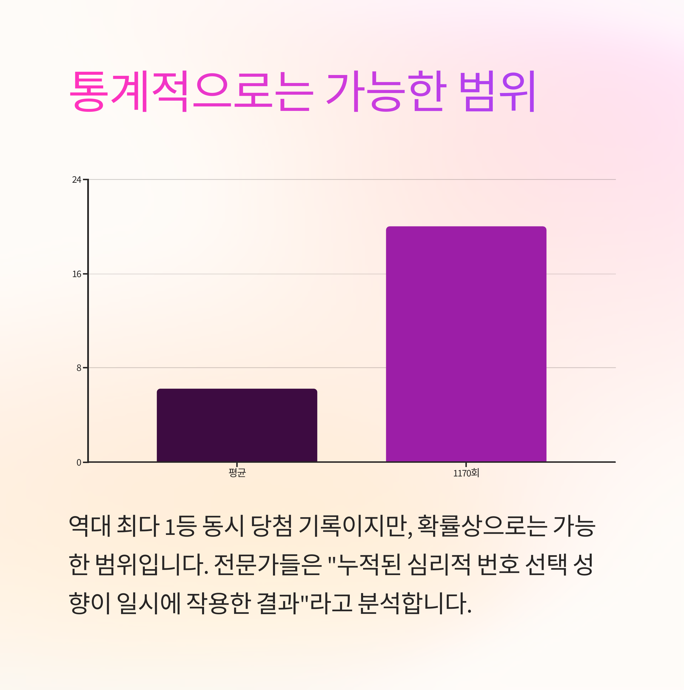 1170회는 역대 최다 1등 동시 당첨 기록이지만, 확률상으로는 가능 범위 내라는 해석입니다. 전문가들은 **“누적된 심리적 번호 선택 성향이 일시에 작용한 결과”**라고 분석합니다.
