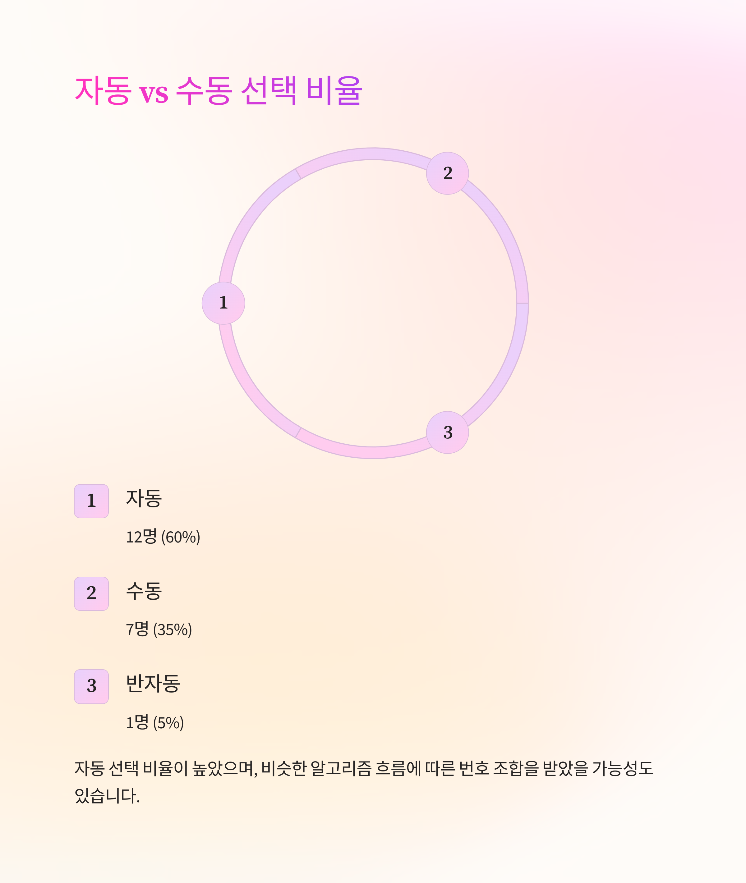 1170회 기준으로, 1등 20명 중 자동 12명, 수동 7명, 반자동 1명이었습니다. 이는 자동 선택의 비율이 상대적으로 높았음을 보여주며, 많은 사람들이 비슷한 알고리즘 흐름에 따른 번호 조합을 받았을 가능성도 고려됩니다.