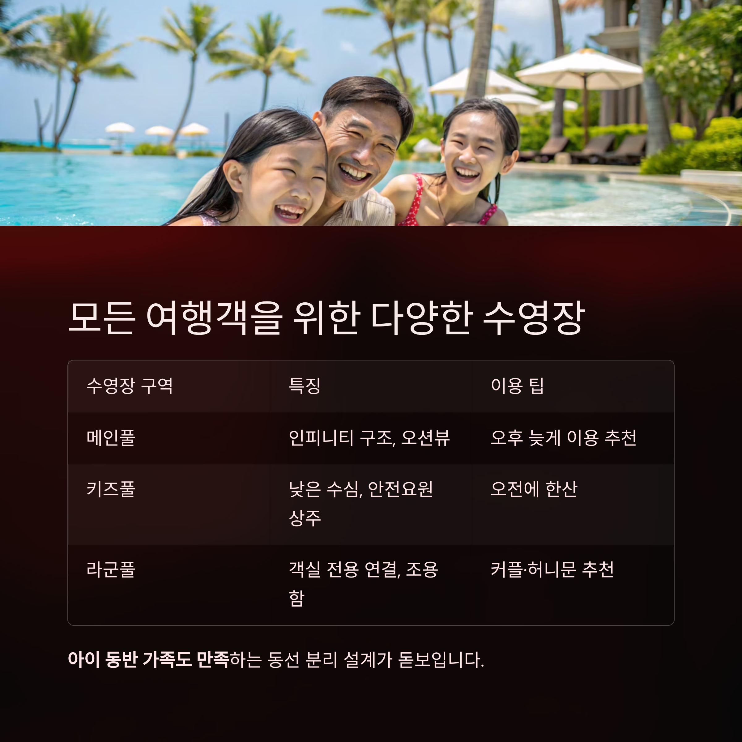 | 메인풀 | 인피니티 구조, 오션뷰 | 오후 늦게 이용 추천 |