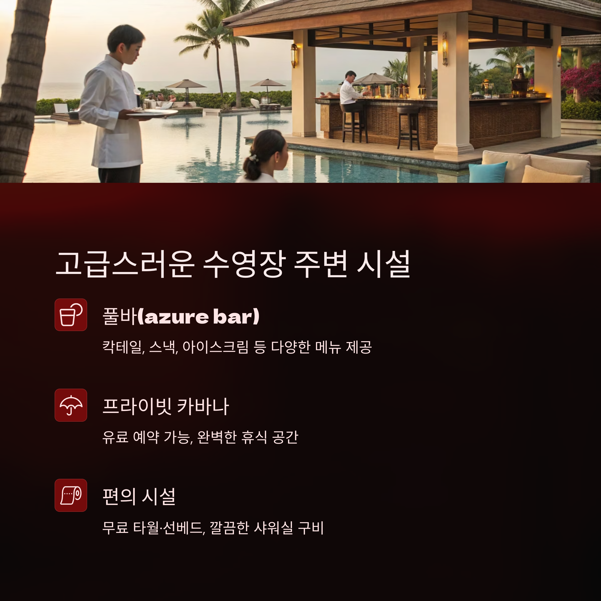 - 포인트: 풀 끝 가장자리 + 바다 방향 선베드