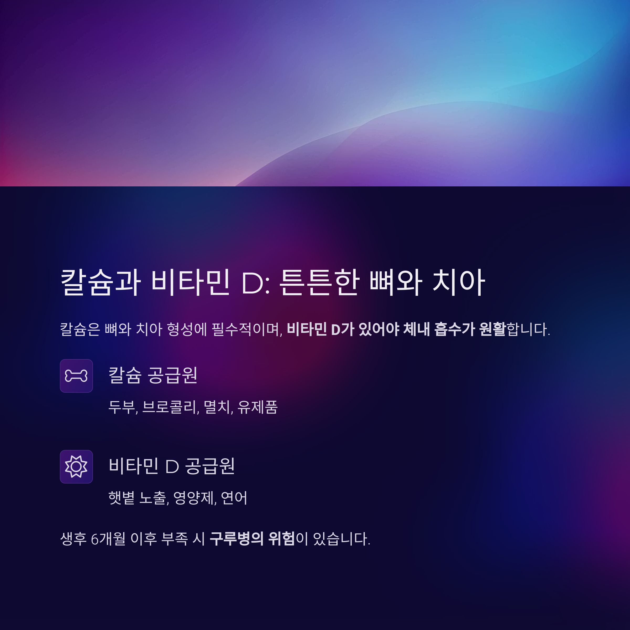 칼슘은 뼈와 치아 형성에 절대적으로 필요하며, 비타민 D가 있어야 체내 흡수가 원활해집니다.