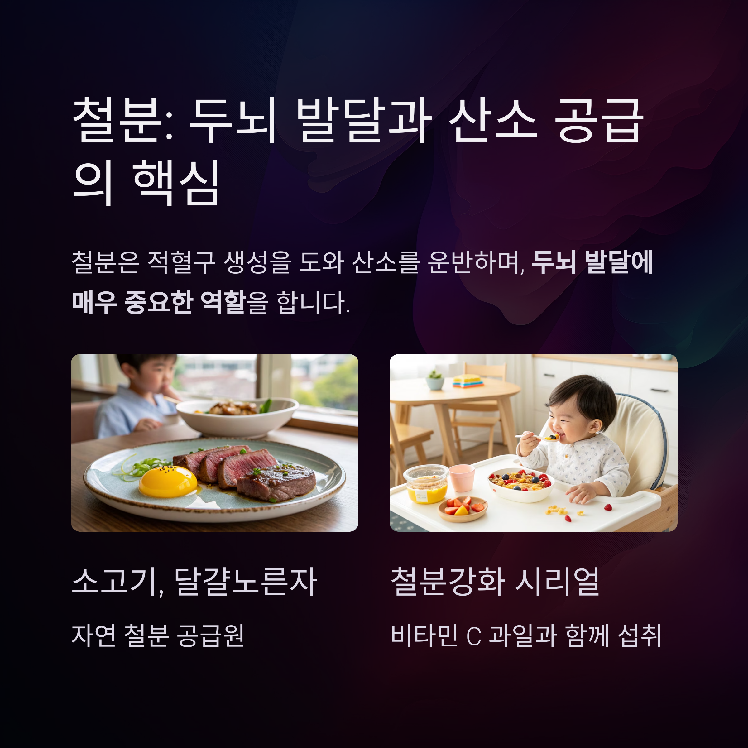 철분은 적혈구 생성을 도와 산소를 운반하며, 두뇌 발달에 매우 중요한 역할을 합니다.