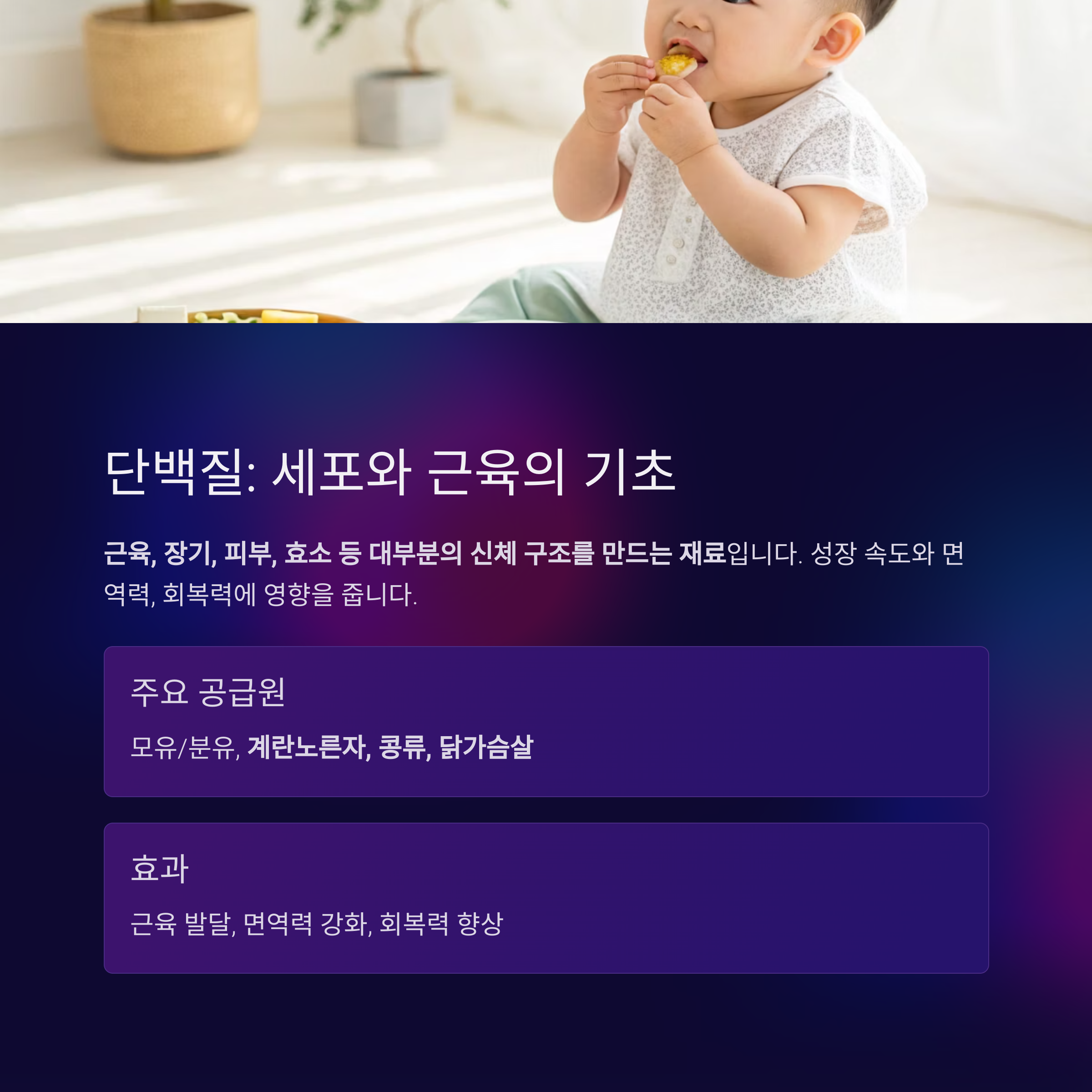 모유나 분유에서 기본적인 단백질을 섭취하며, 이유식에서는 계란노른자, 콩류, 닭가슴살 등이 주요 공급원이 됩니다.