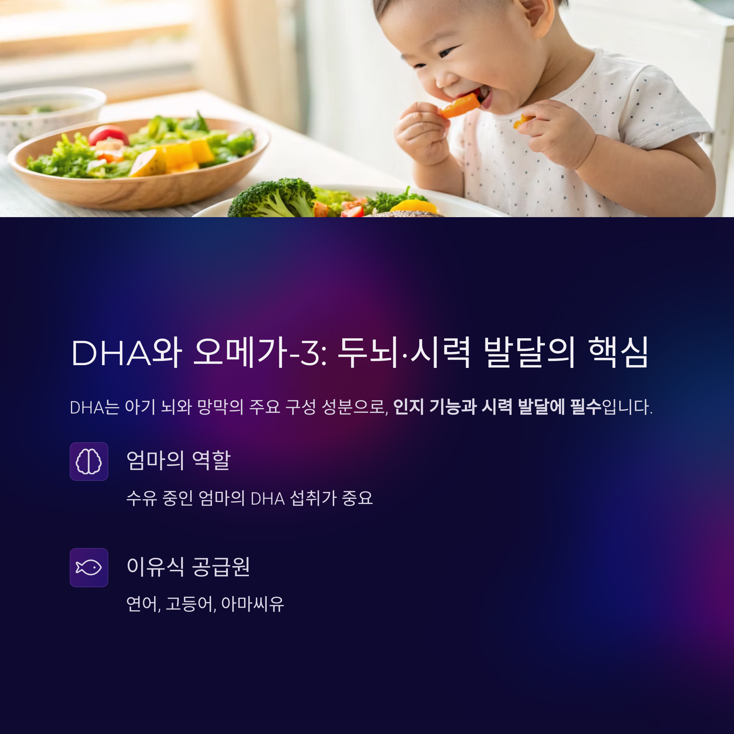 DHA는 아기 뇌와 망막의 주요 구성 성분으로, 인지 기능과 시력 발달에 필수입니다.