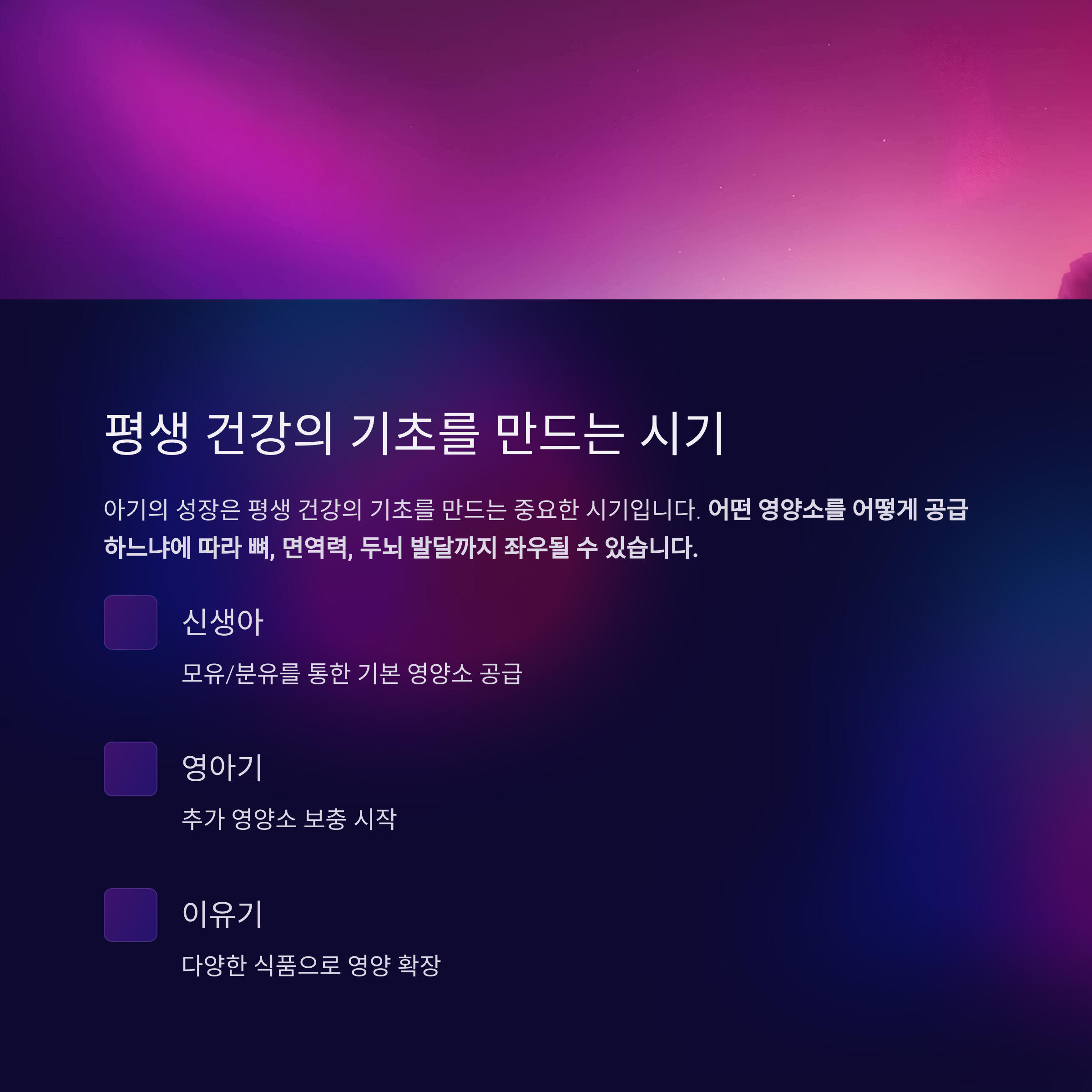 이 시기에 어떤 영양소를 어떻게 공급하느냐에 따라 뼈, 면역력, 두뇌 발달까지 좌우될 수 있습니다.