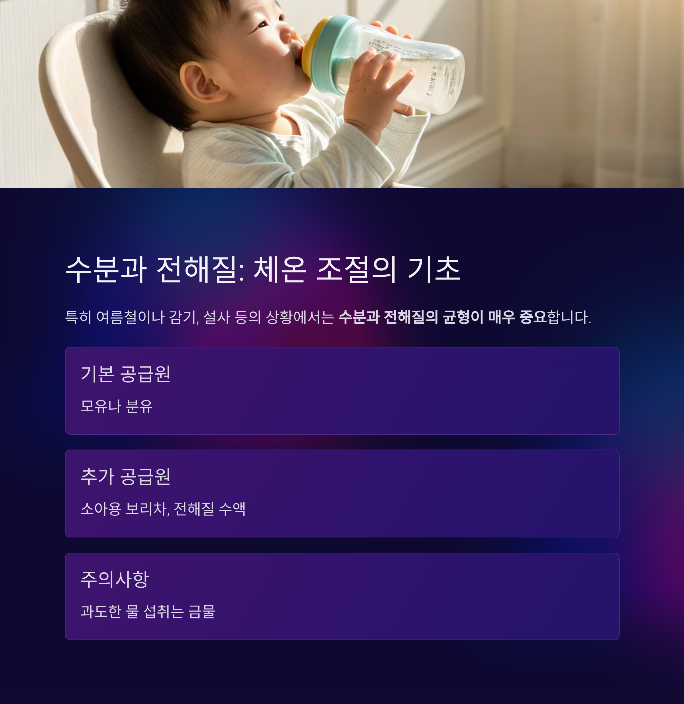 특히 여름철이나 감기, 설사 등의 상황에서는 수분과 전해질의 균형이 매우 중요합니다.