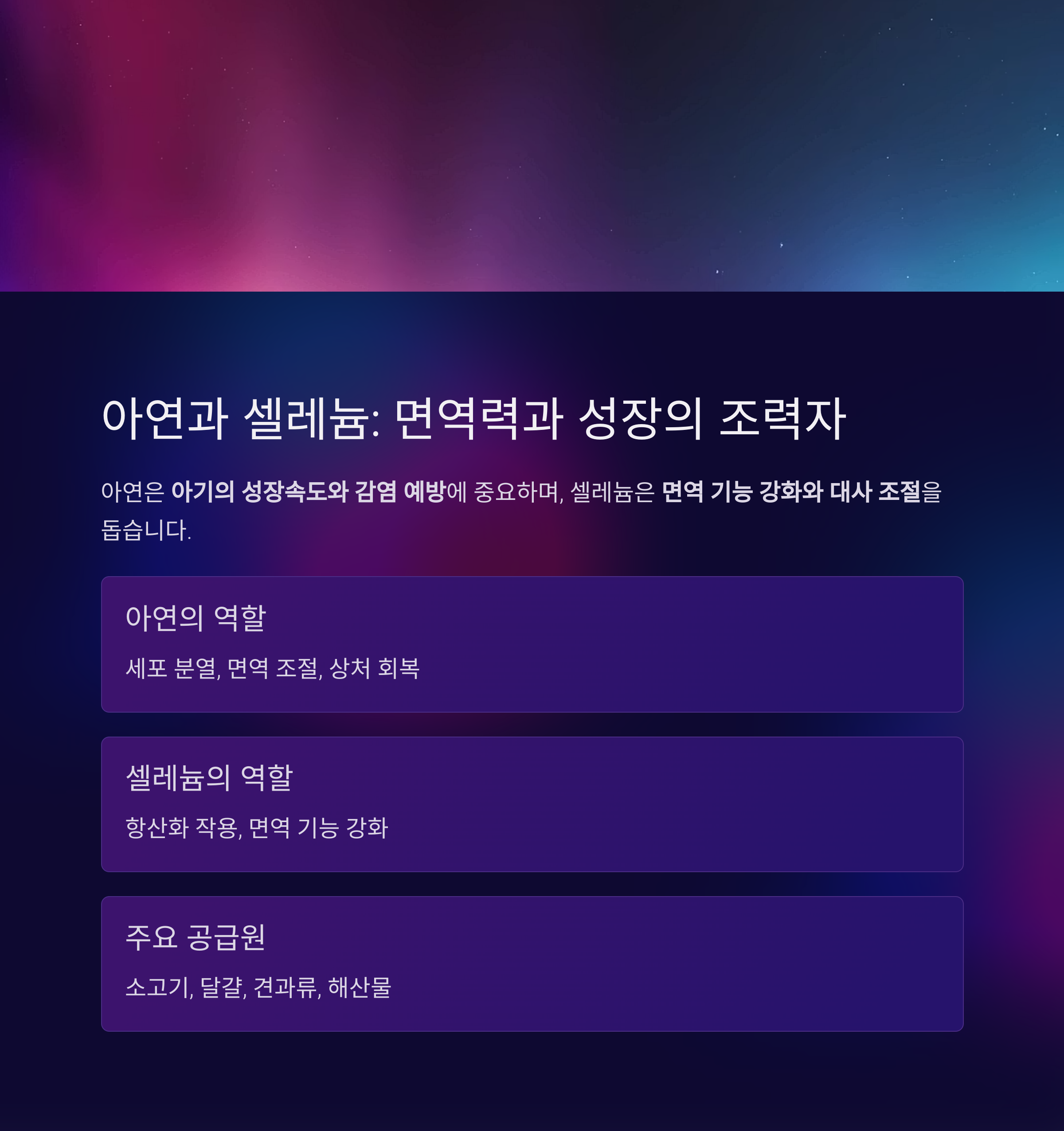 아연은 세포 분열, 면역 조절, 상처 회복에 관여하며, 아기의 성장속도와 감염 예방에 중요한 역할을 합니다.