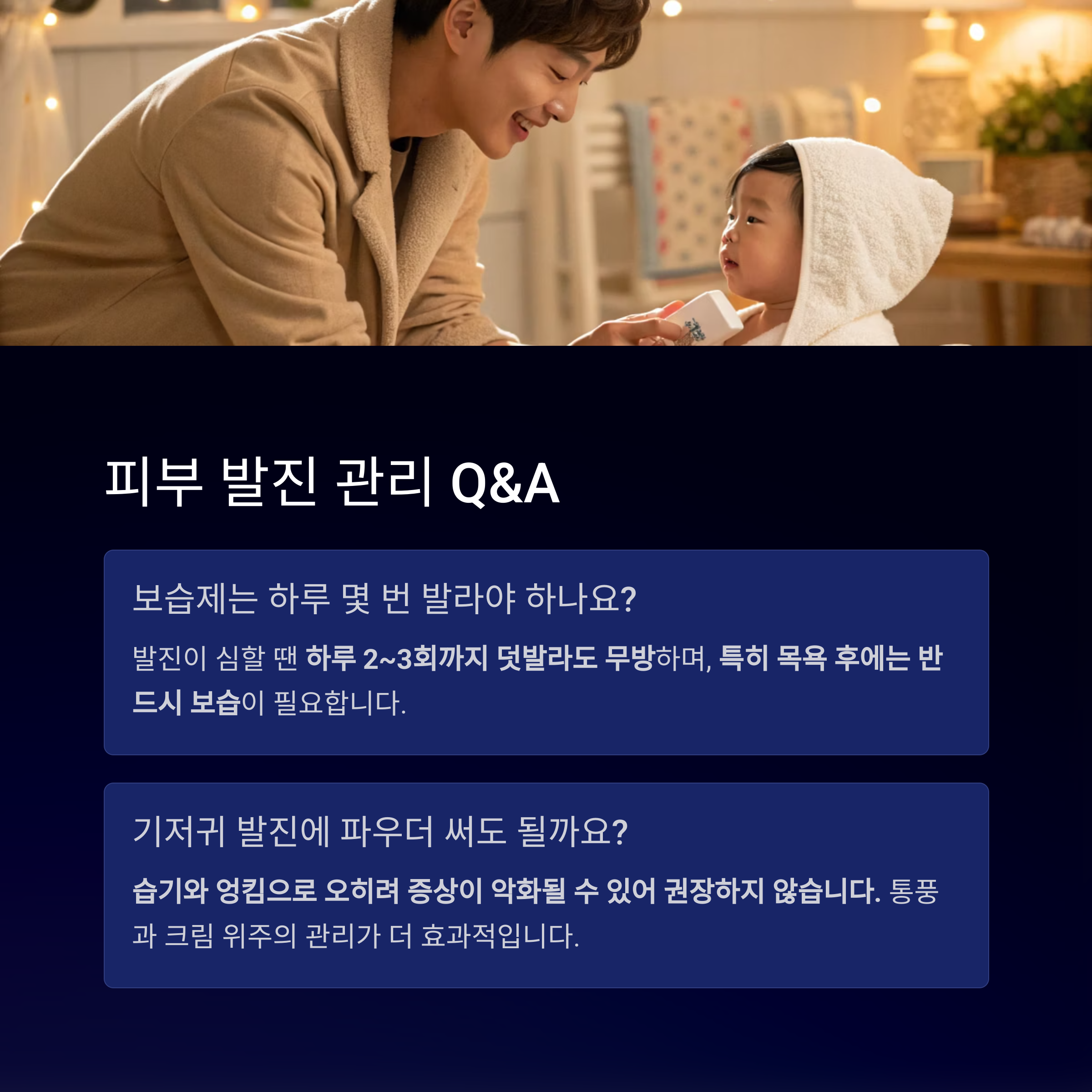 → 발진이 심할 땐 하루 2~3회까지 덧발라도 무방하며, 특히 목욕 후에는 반드시 보습이 필요합니다.