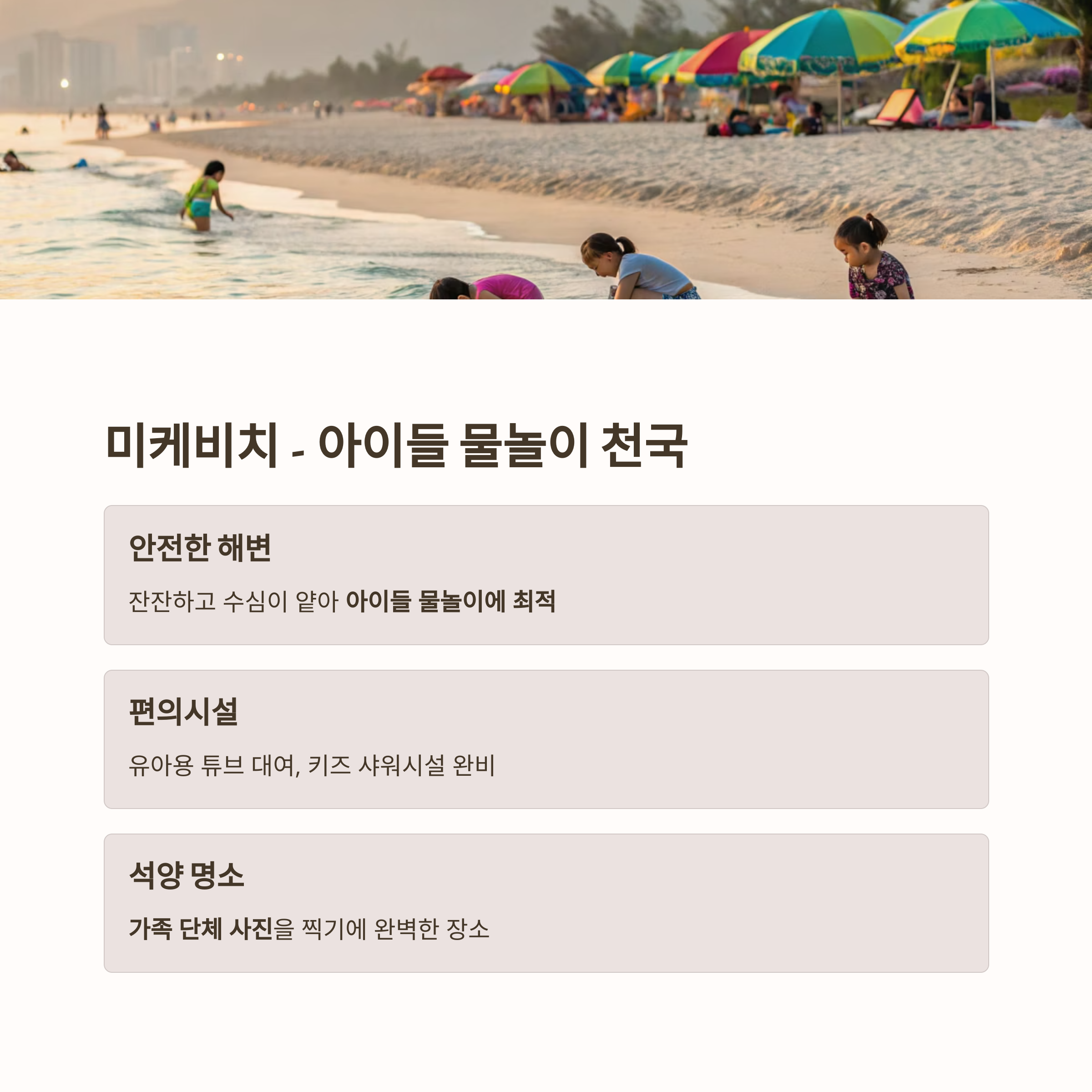 | 미케비치 | 얕은 바닷물, 안전한 물놀이 | 오전, 석양 시간 |