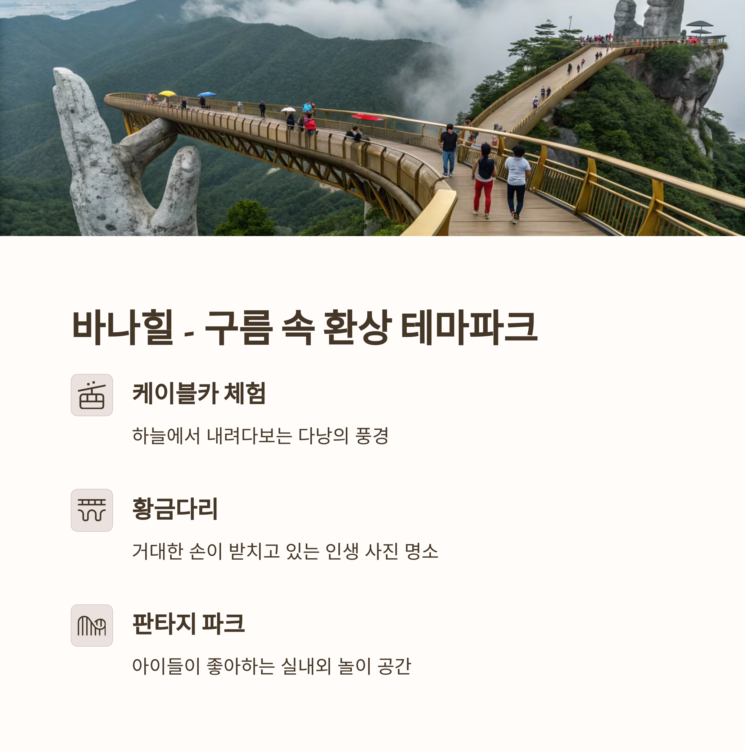 | 바나힐 | 케이블카, 테마파크, 판타지파크 | 오전~오후 |