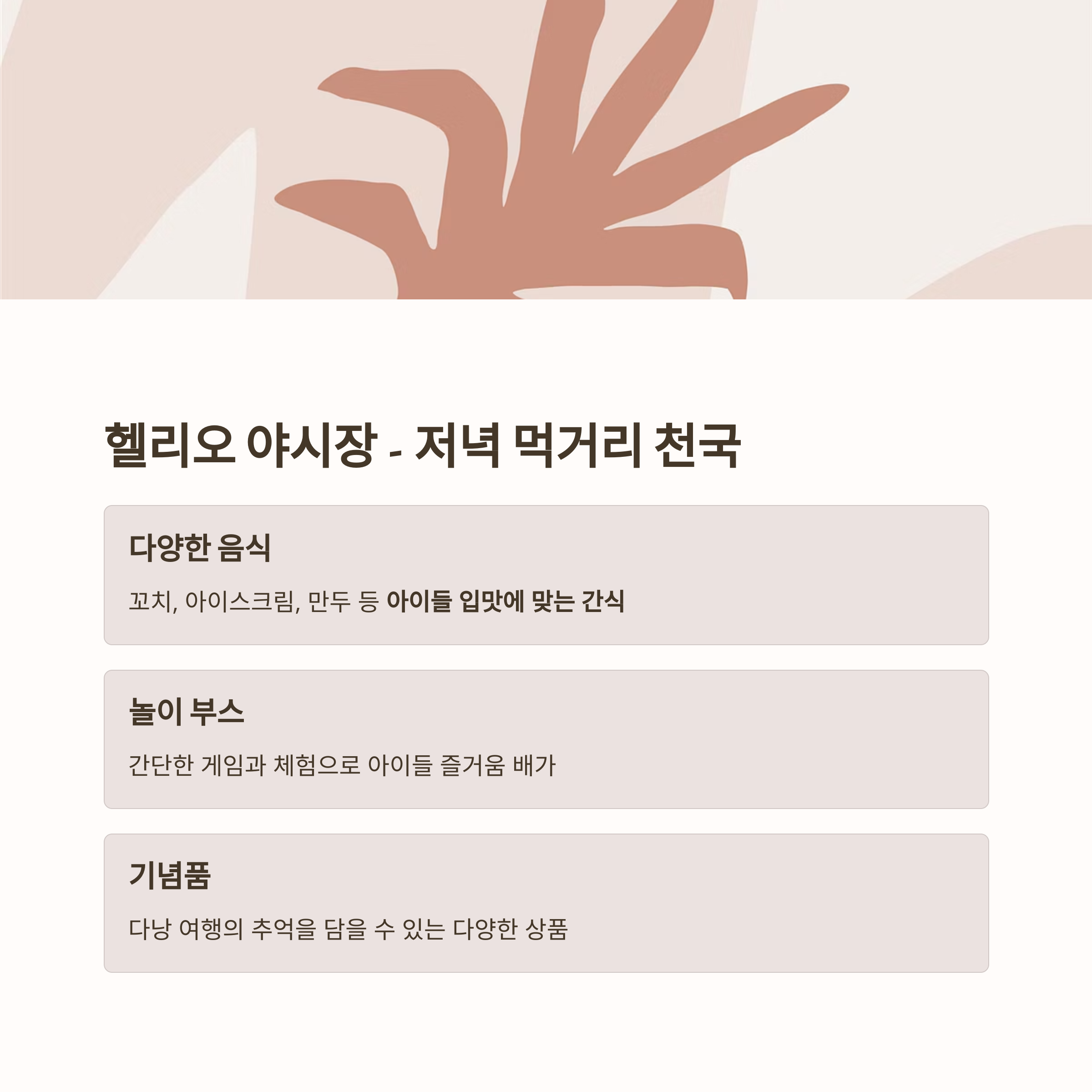 | 헬리오 야시장 | 다양한 먹거리, 놀이존, 가족 분위기 | 저녁~야간 |
