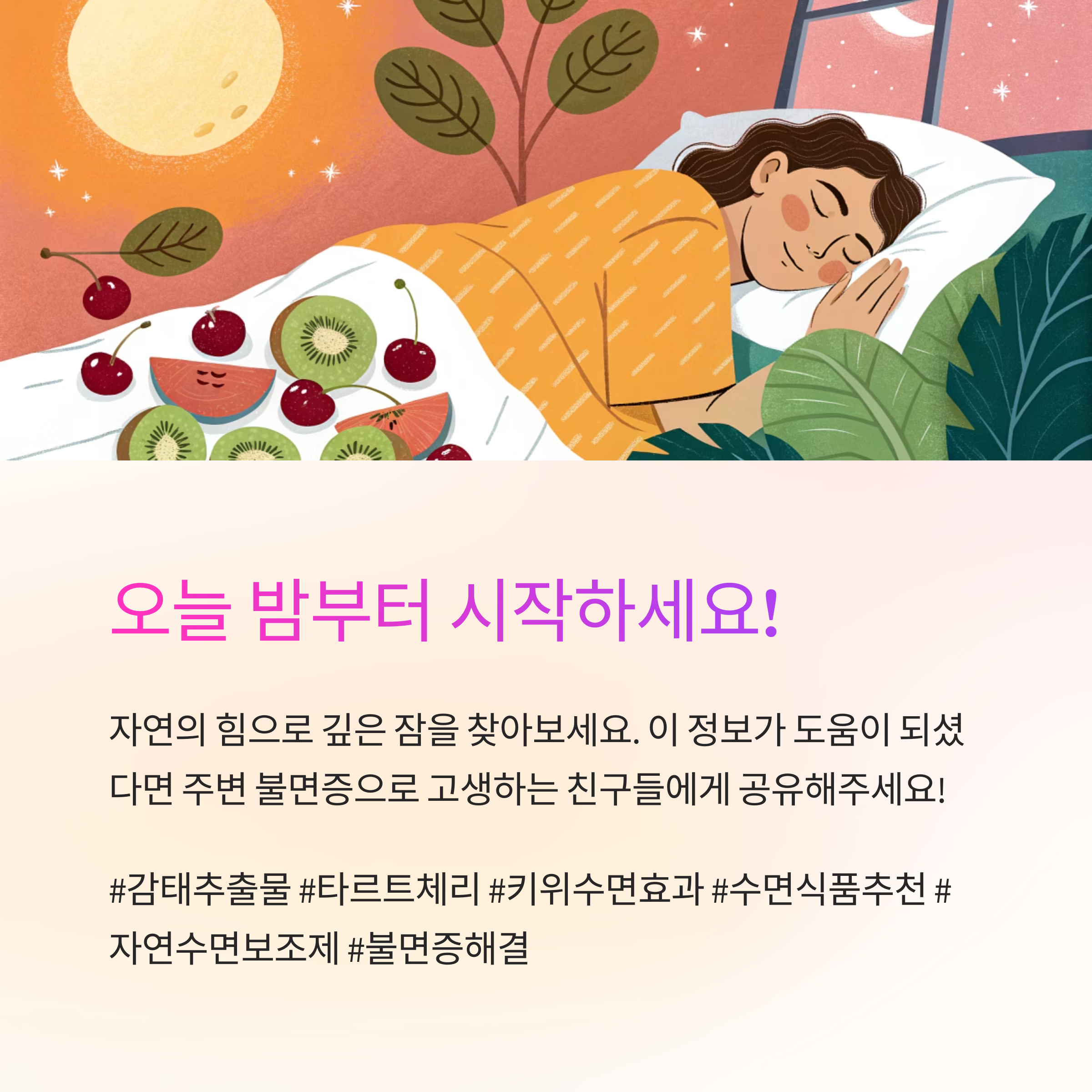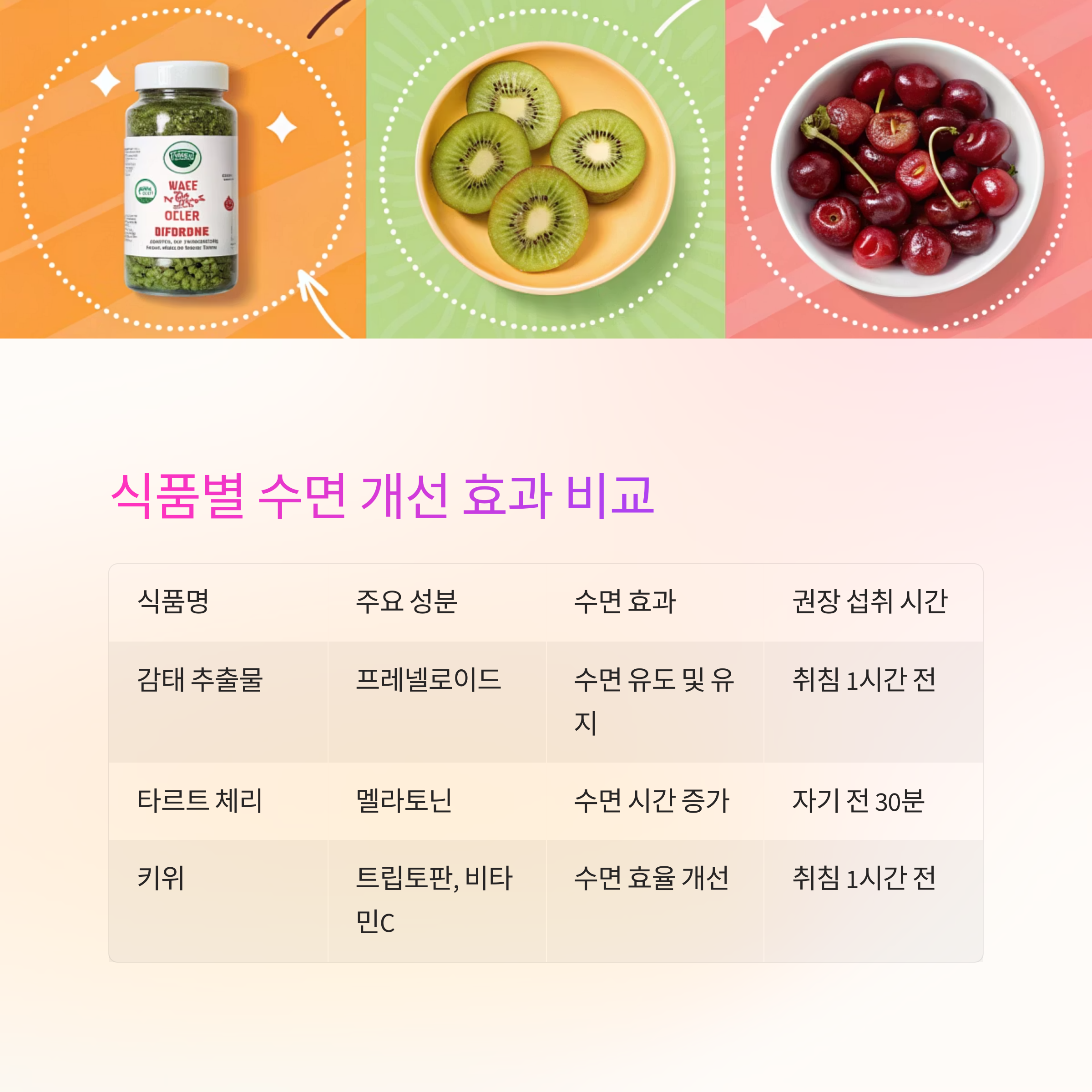 | 키위 | 트립토판, 비타민C | 수면 효율 개선 | 취침 1시간 전 |