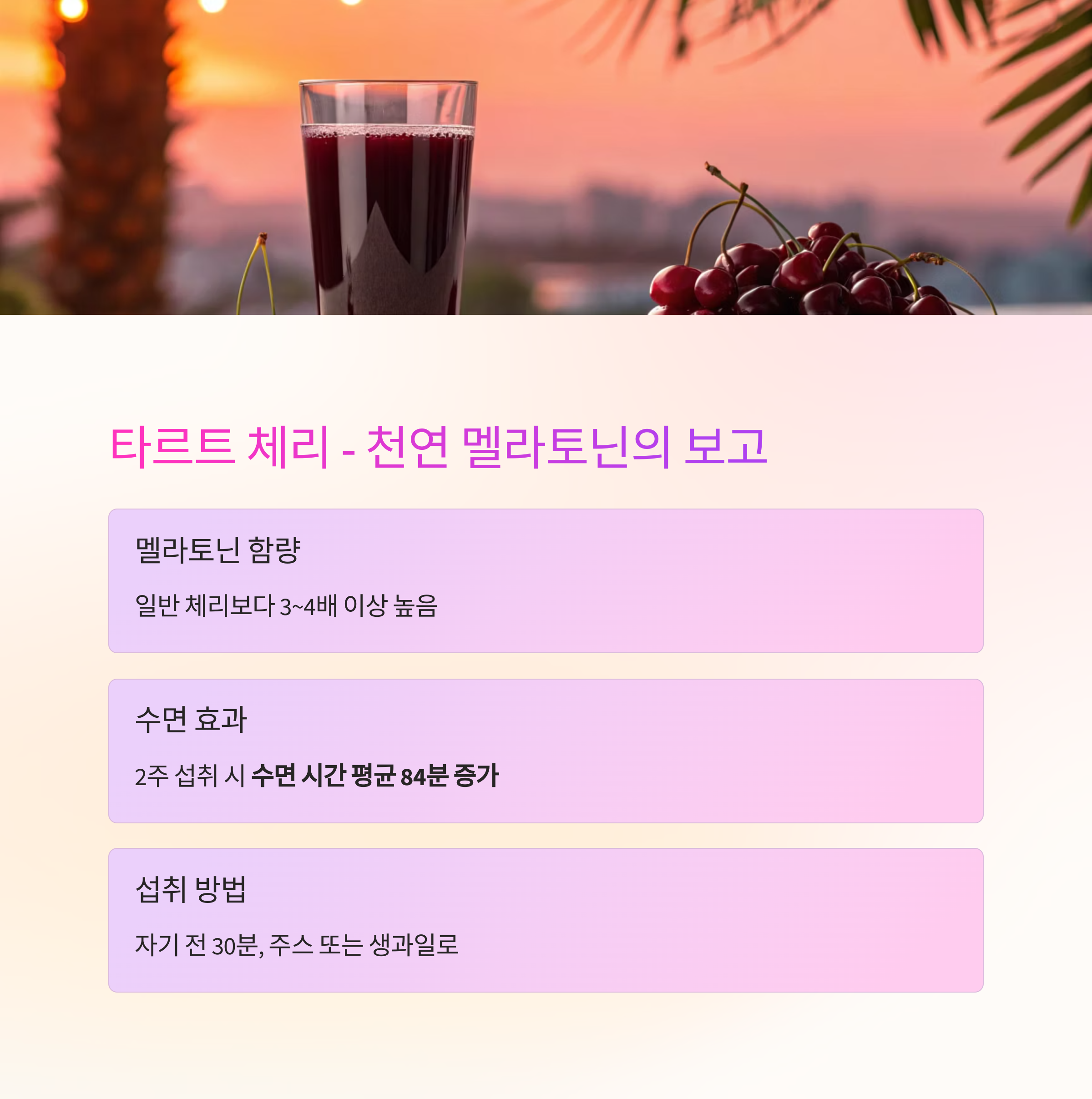 | 타르트 체리 | 멜라토닌 | 수면 시간 증가 | 자기 전 30분 |
