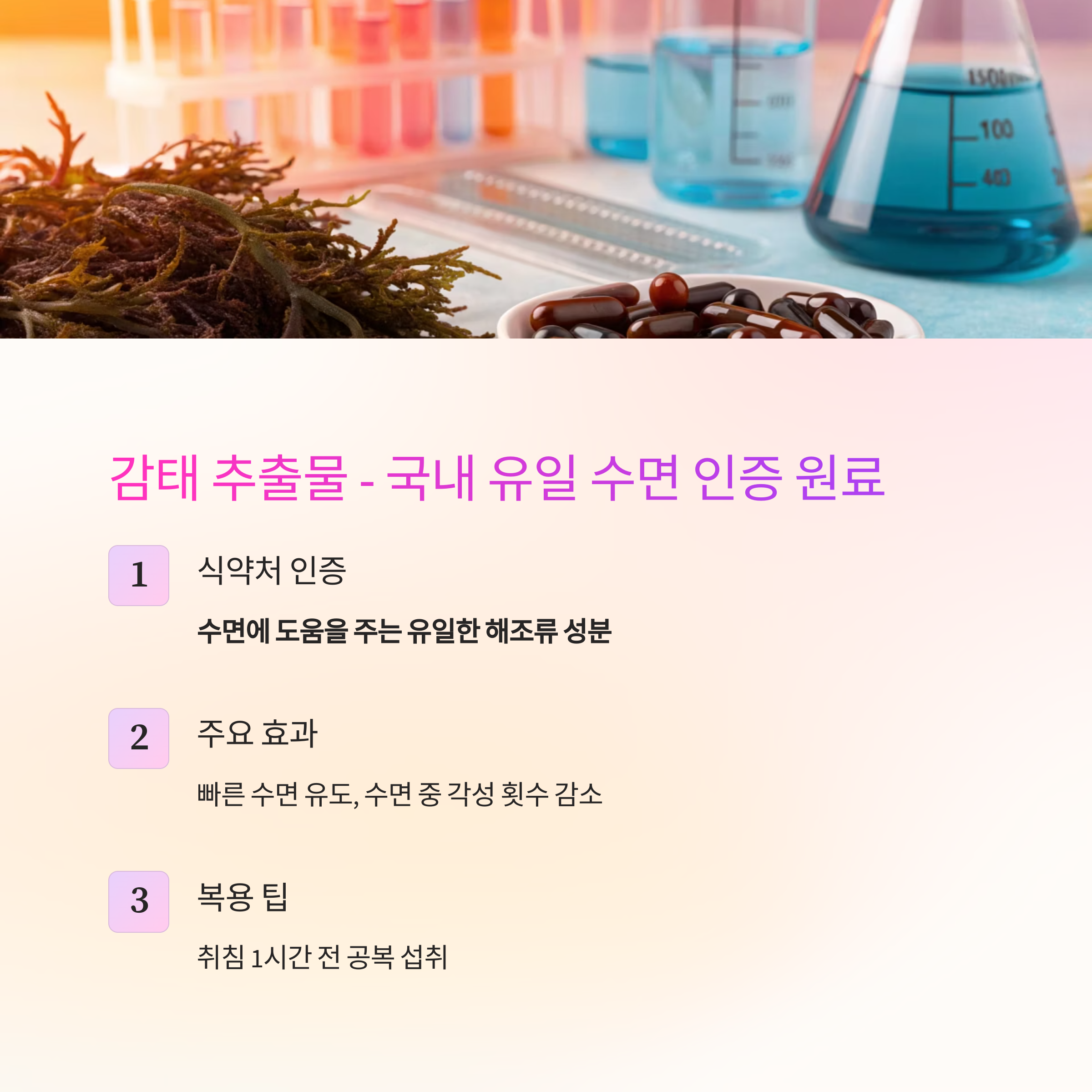 | 자기 전 1시간 | 감태 추출물 300mg | 수면 유도 및 유지 |