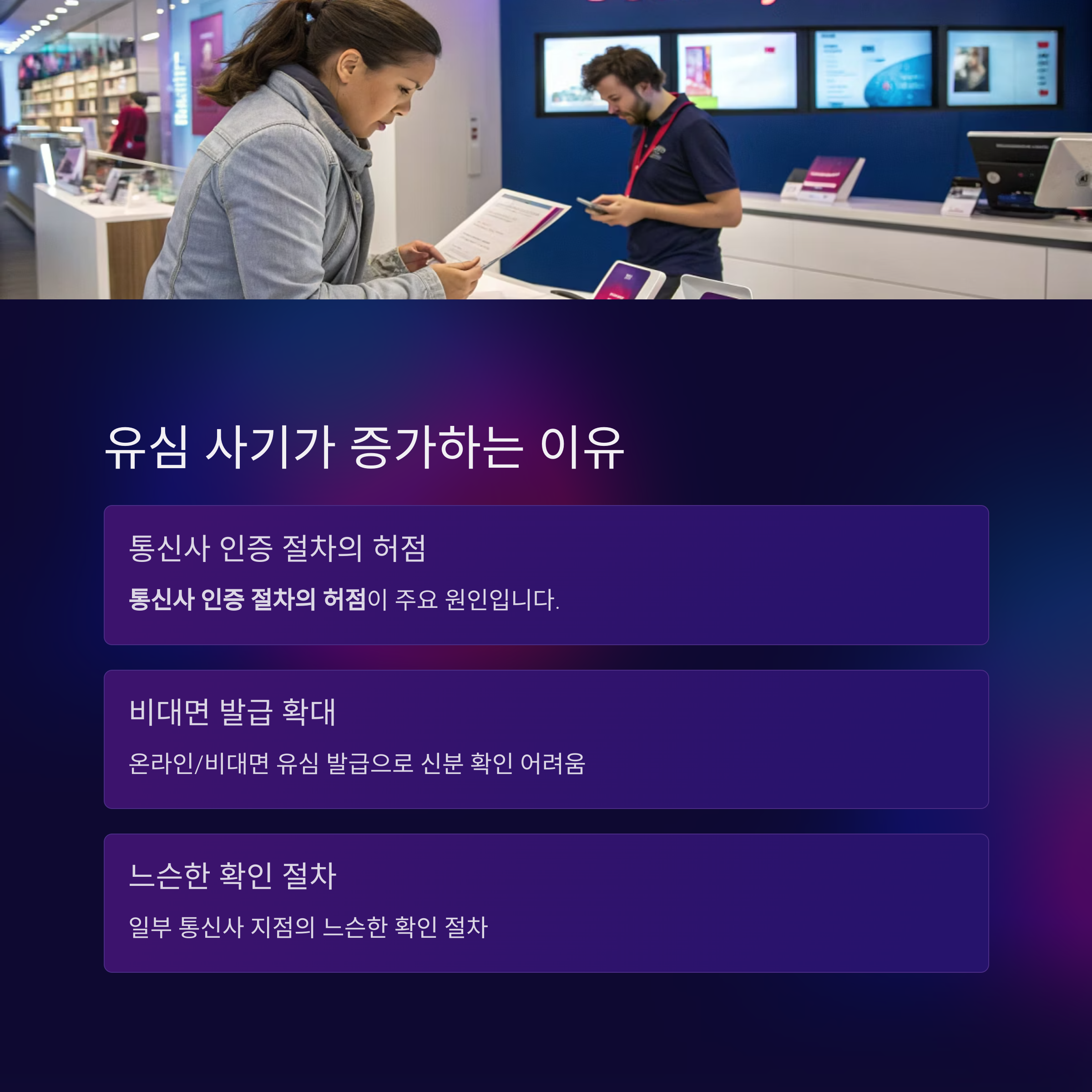 전문가들은 통신사 인증 절차의 허점을 원인으로 지목합니다. 온라인/비대면 유심 발급이 가능해진 이후, 신분증 위조와 같은 고전적인 수법이 다시 유행하고 있습니다. 여기에 통신 3사의 확인 절차가 느슨한 일부 지점에서는 실제 피해를 막지 못하고 있습니다.