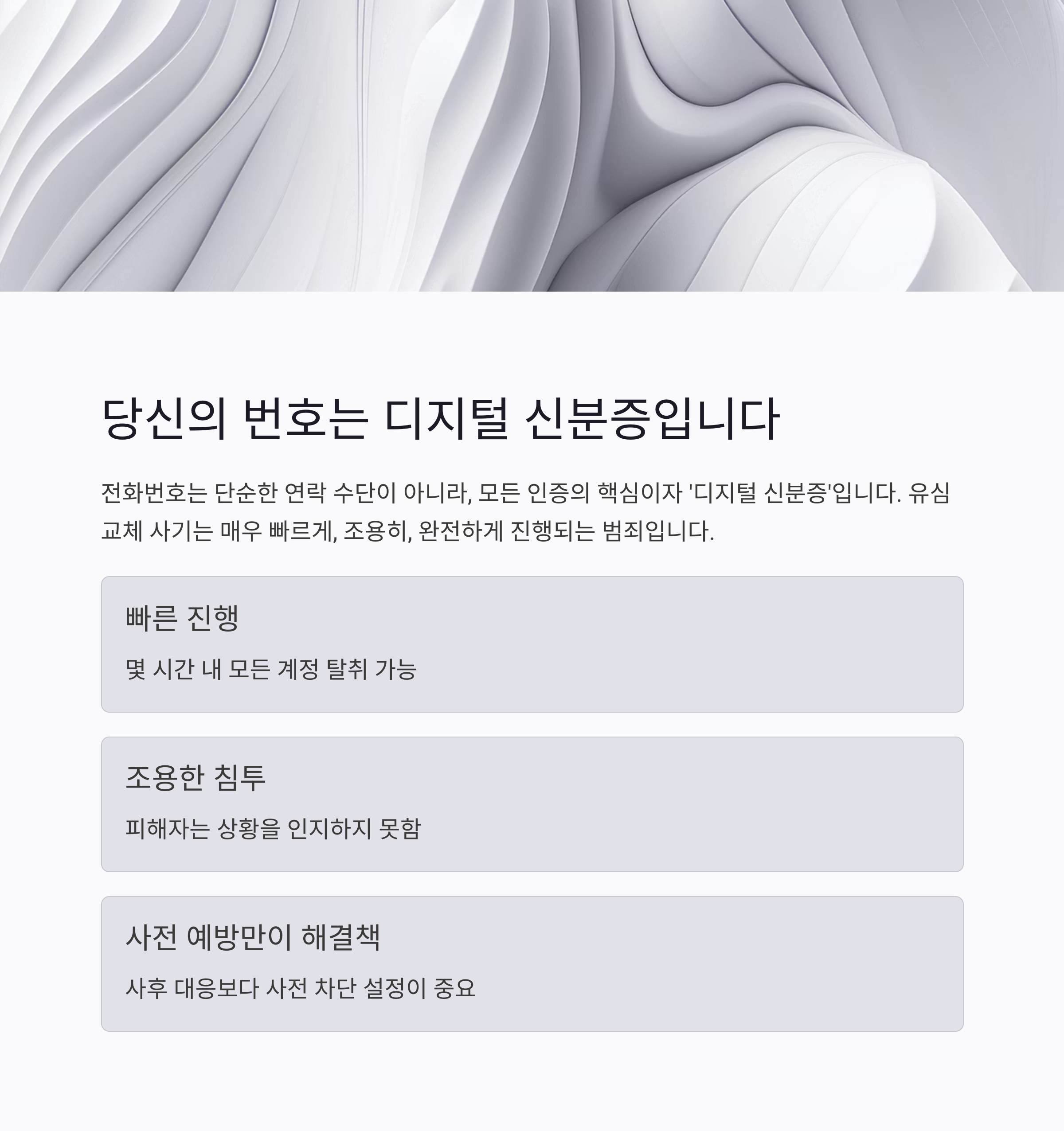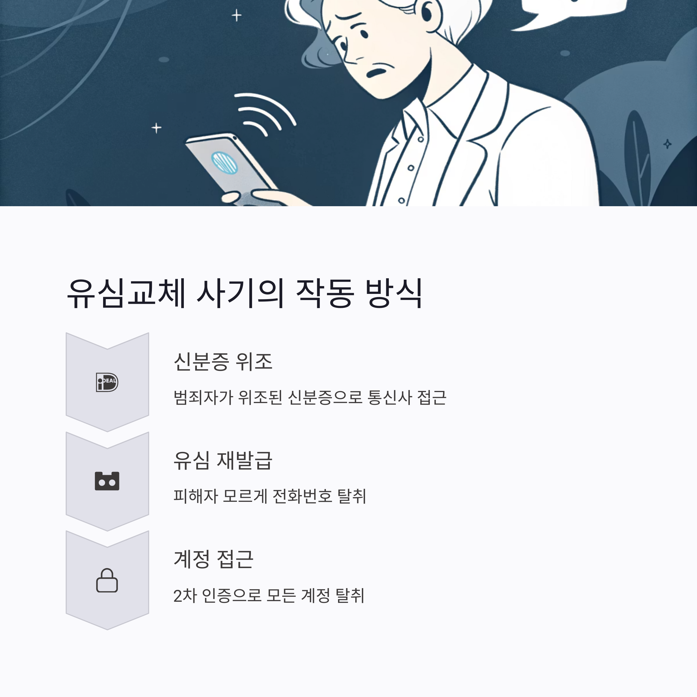 이 사기는 '내 전화번호가 나도 모르게 다른 사람에게 넘어가는' 방식입니다. 범죄자는 위조된 신분증이나 명의도용을 통해 통신사에 유심 재발급을 요청하고, 그 번호로 2차 인증을 받아 각종 금융·SNS·이메일 계정을 탈취합니다. 피해자는 전화가 갑자기 끊기기 전까지 어떤 상황도 인지하지 못한 채 정보 유출을 당합니다.