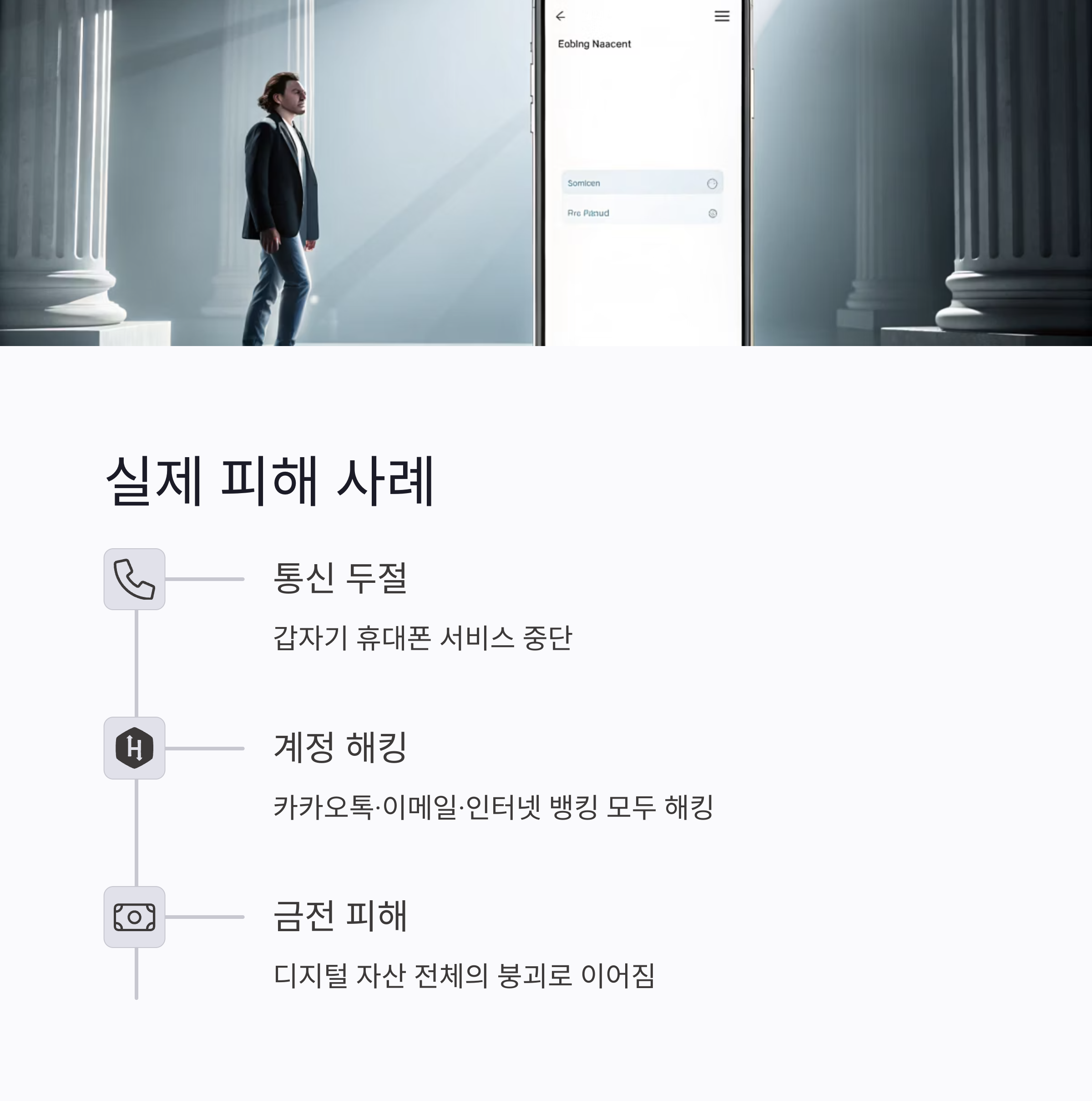 한 피해자는 통신이 갑자기 끊긴 후, 몇 시간 안에 카카오톡·이메일·인터넷 뱅킹이 모두 해킹된 것을 알게 되었습니다. 이후 확인 결과, 유심이 누군가에게 재발급돼 번호 인증이 모두 털린 것이었습니다. 대부분의 인증이 전화번호 기반으로 작동되는 현실에서, 단 한 번의 유심교체가 '디지털 자산 전체의 붕괴'로 이어졌던 것입니다.