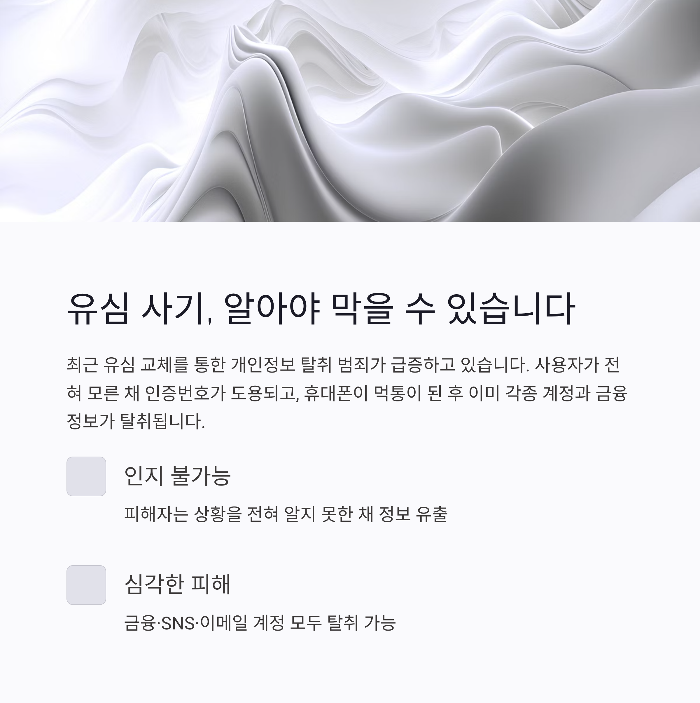 최근 유심 교체를 통한 개인정보 탈취 범죄가 급증하고 있습니다. 특히 사용자가 전혀 모른 채 인증번호가 도용되고, 휴대폰이 먹통이 된 후 이미 각종 계정과 금융 정보가 탈취되는 사례가 많아지고 있습니다. 본문에서는 유심 사기의 전개 방식과 일반 사용자들이 반드시 설정해야 할 예방 수단을 소개합니다.