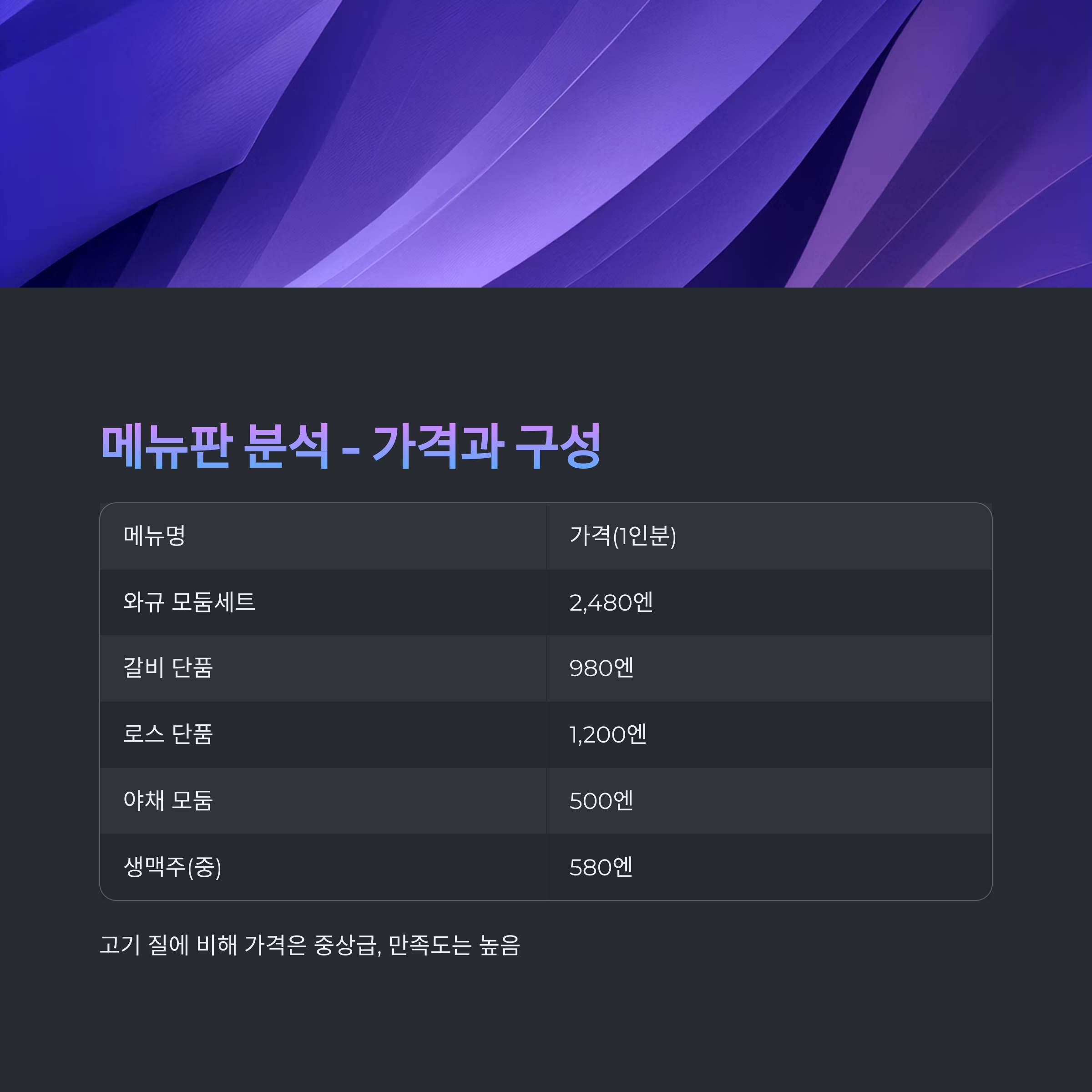 | 추천 메뉴 | 와규 모둠세트, 갈비살, 로스 |