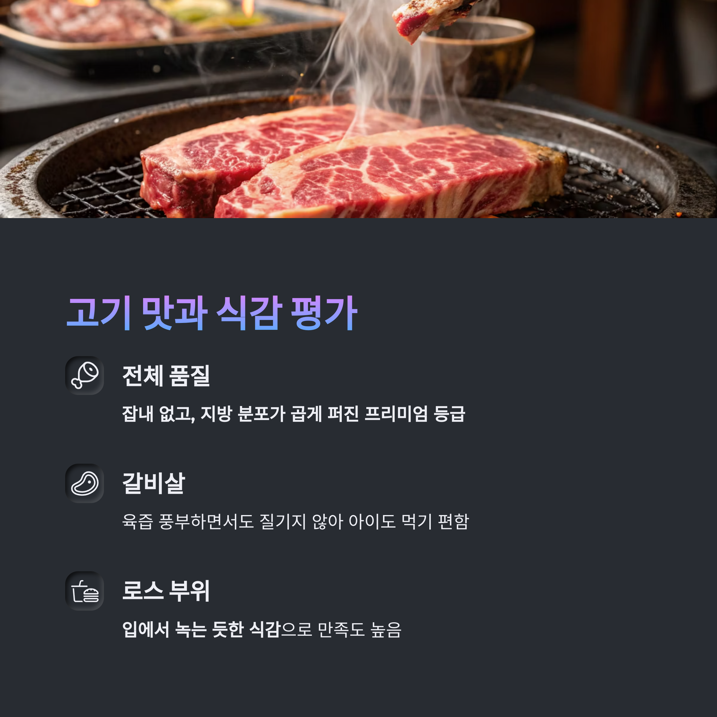 고기는 전반적으로 잡내 없고, 지방 분포가 곱게 퍼진 프리미엄 등급이었습니다.