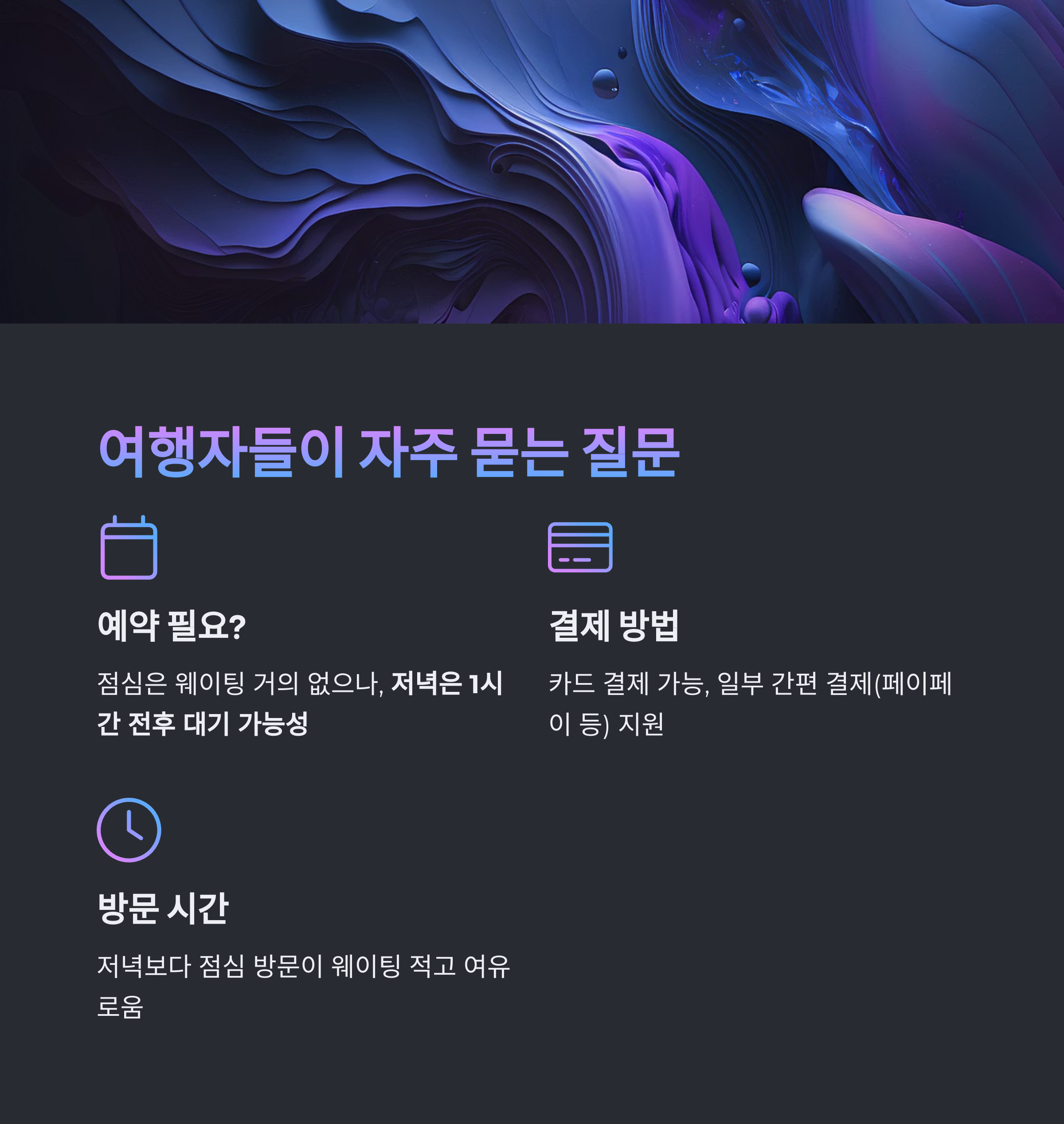 → 점심 시간대는 웨이팅 거의 없으나, 저녁은 1시간 전후 대기 발생 가능성이 있으니