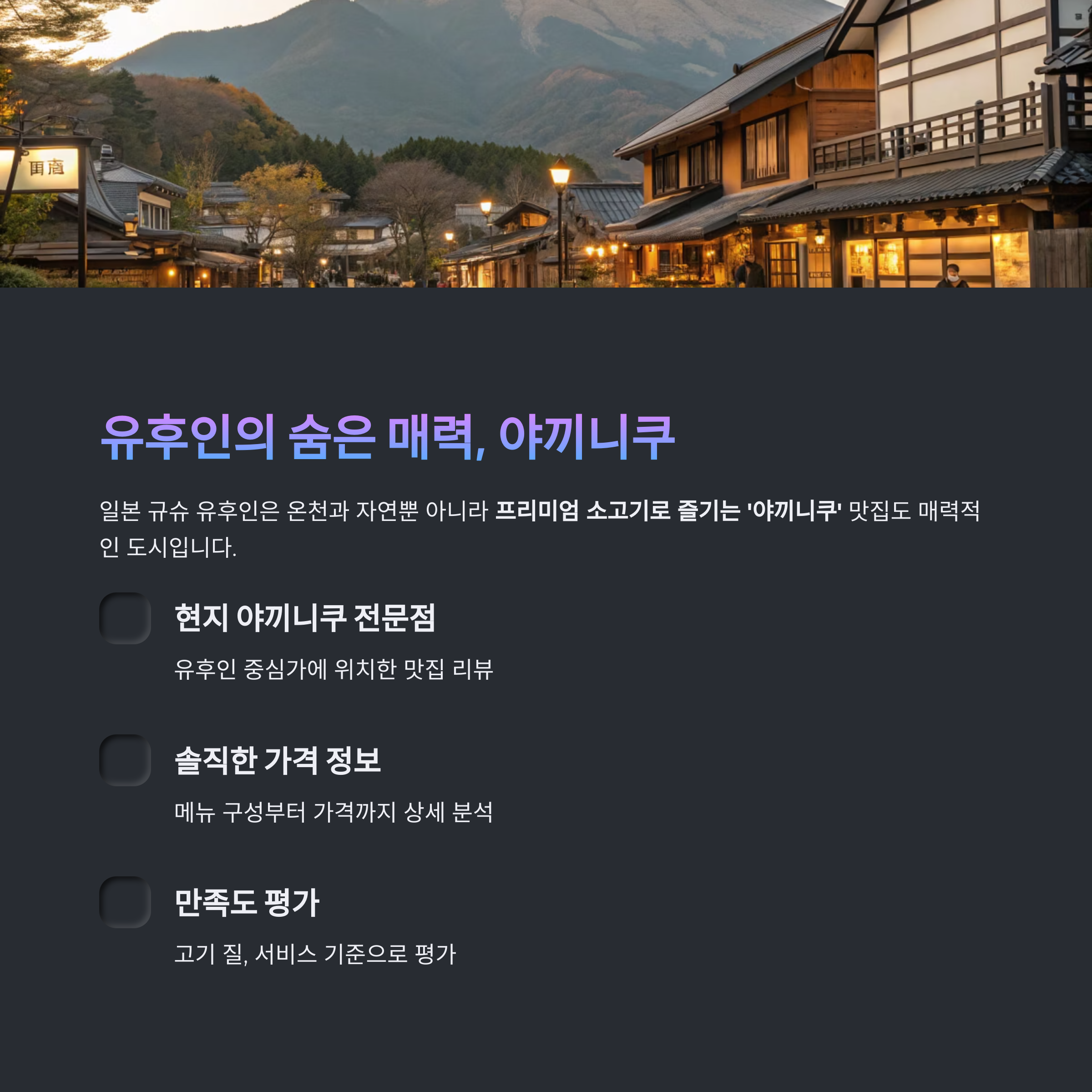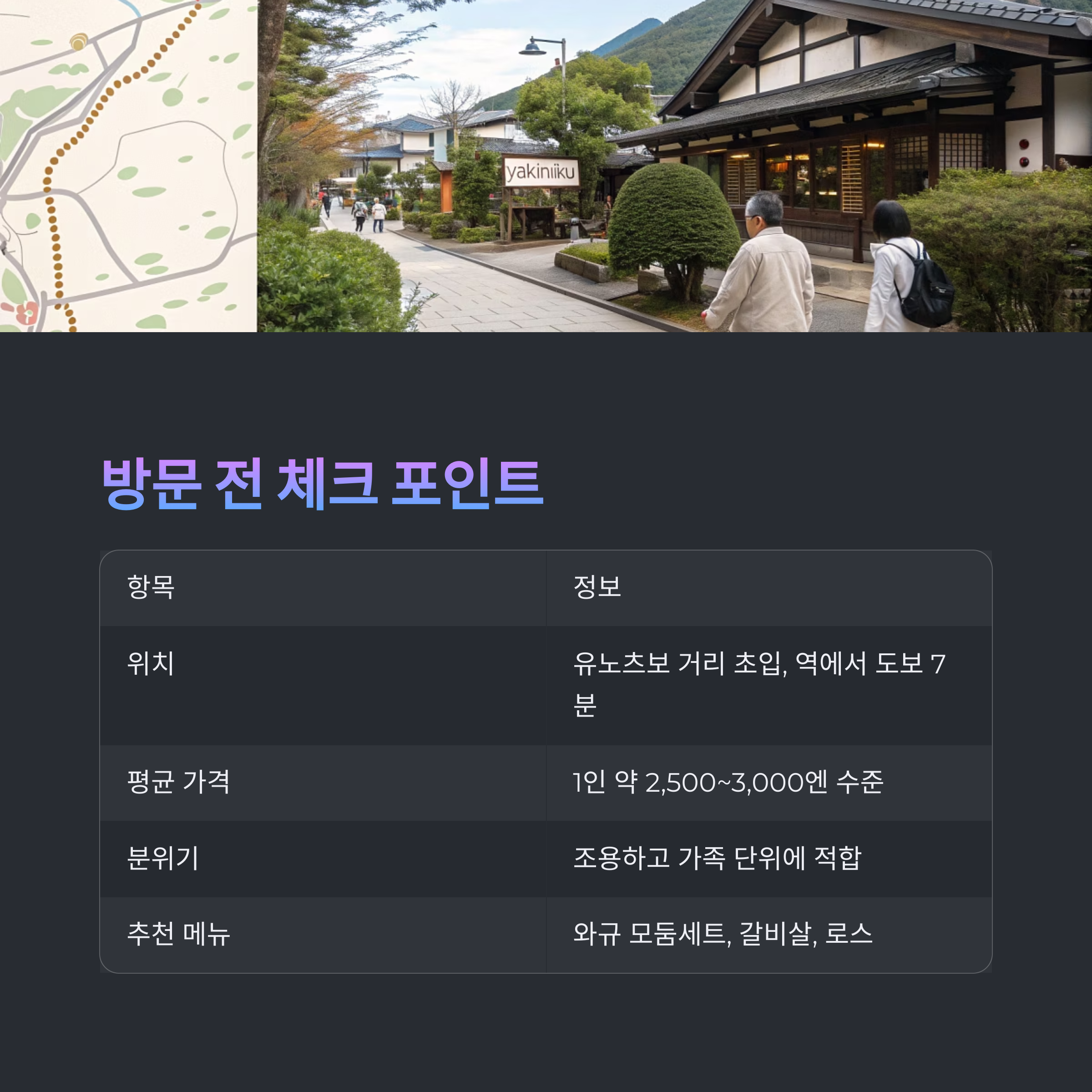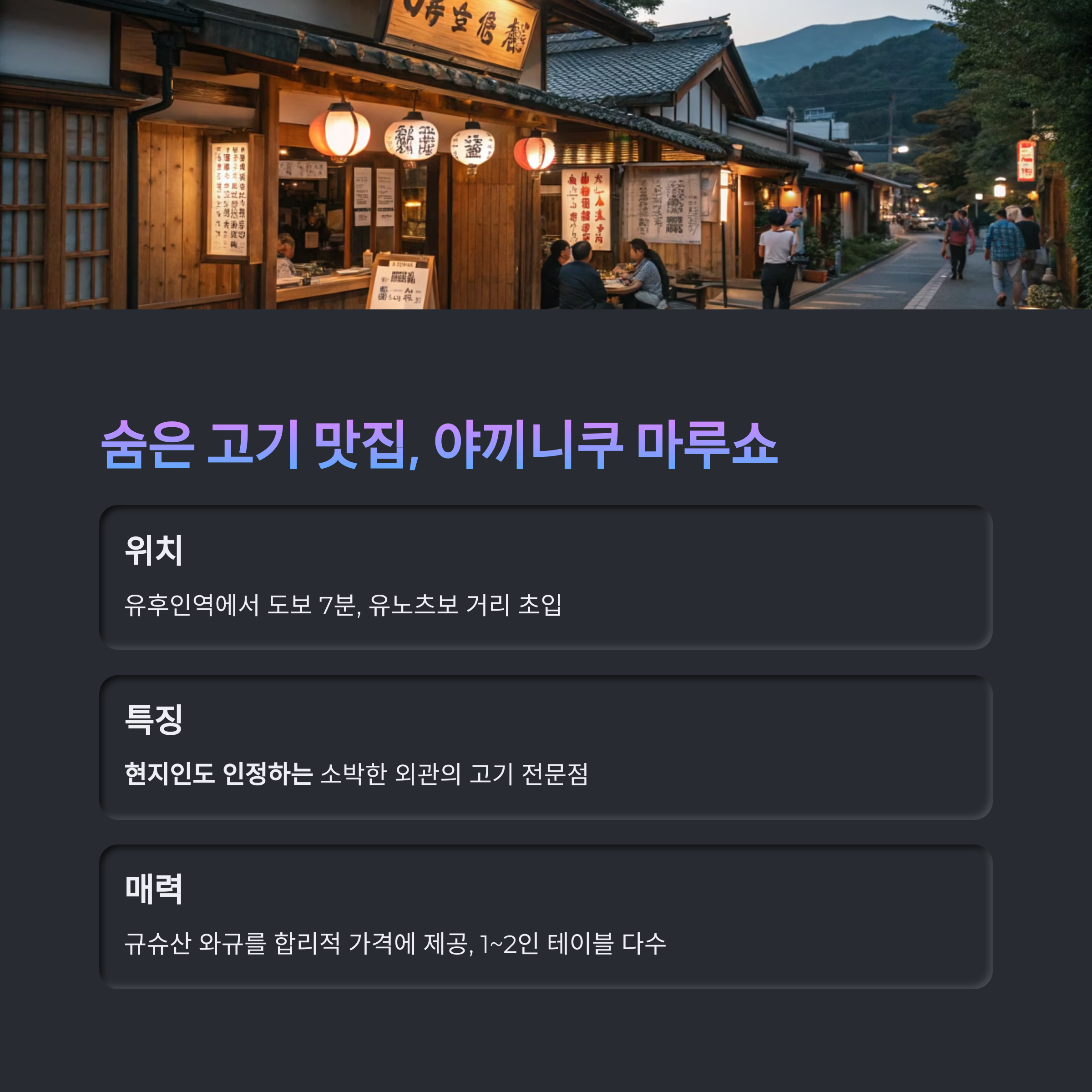 이번 글에서는 유후인 중심가에서 방문한 현지 야끼니쿠 전문점의 솔직한 리뷰와 가격 정보를