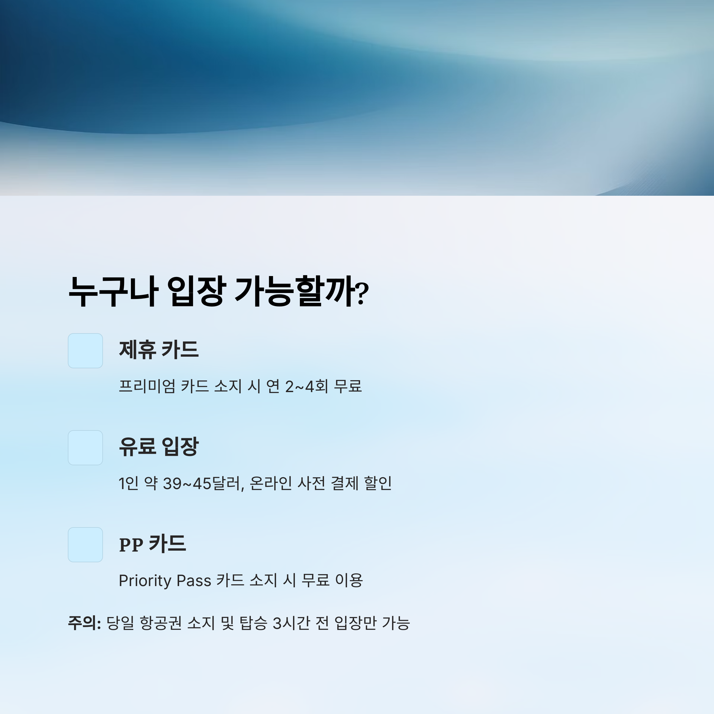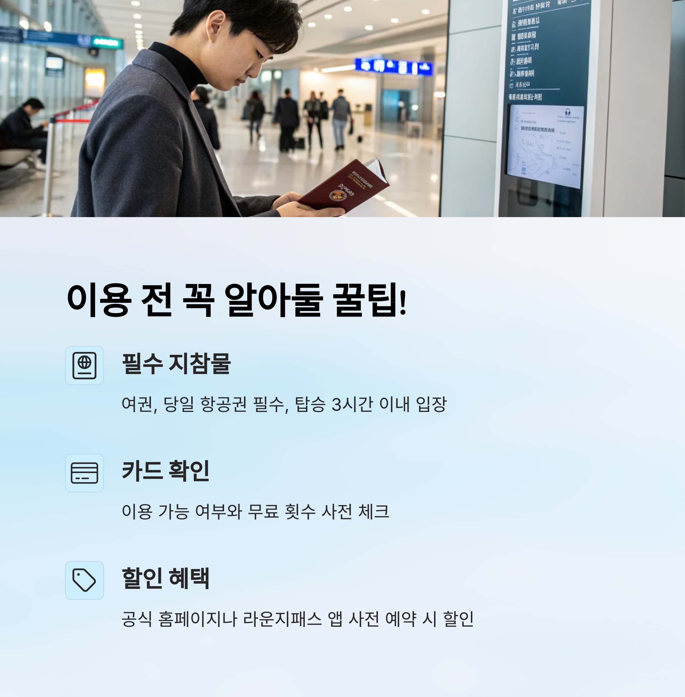 주의사항: 카드 무료 이용 시에도 당일 항공권 소지 및 탑승 3시간 전 입장만 가능하다는 제한이 있습니다.