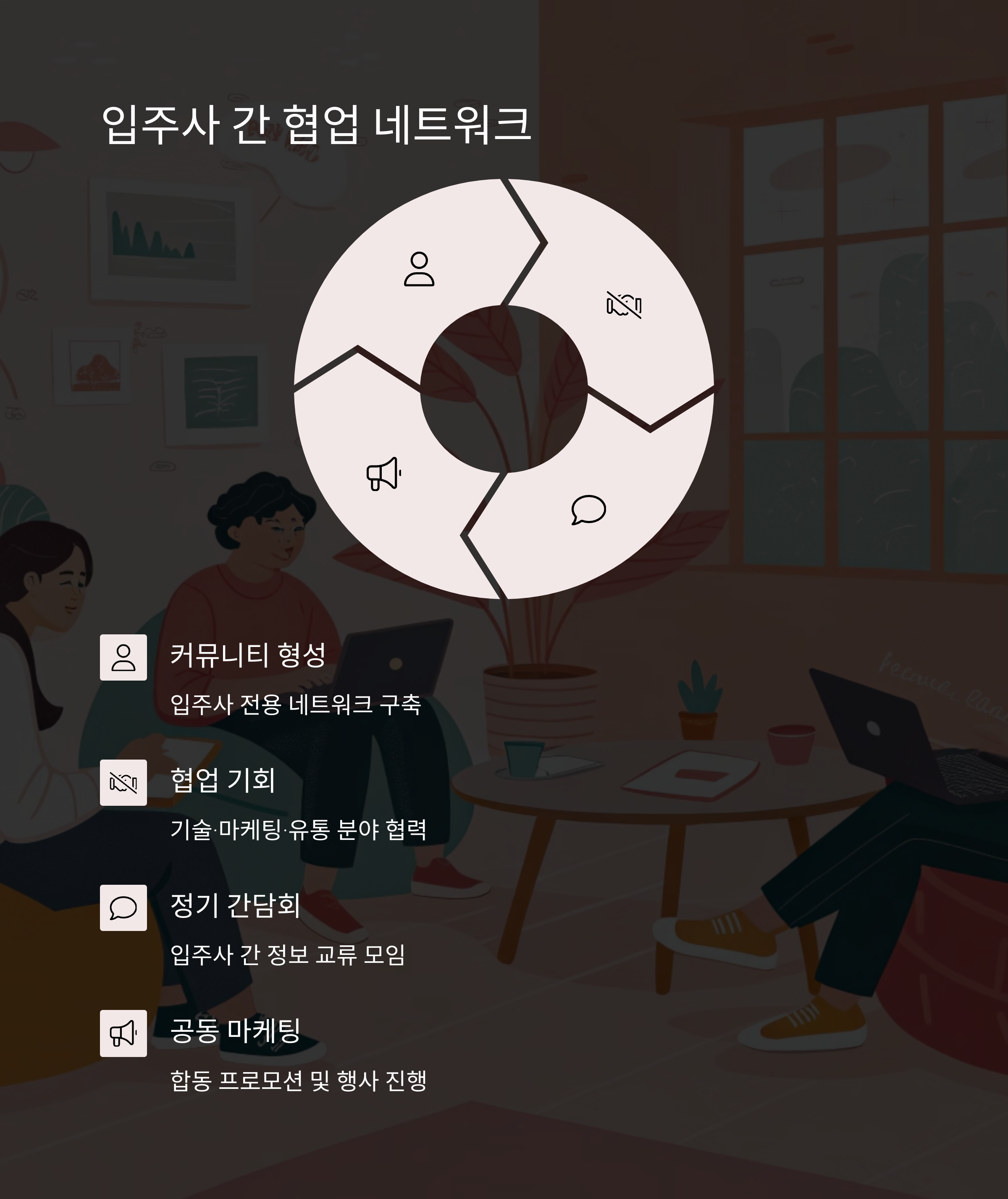 입주사 전용 커뮤니티 게시판, 정기 간담회, 공동 마케팅 행사 등을 통해