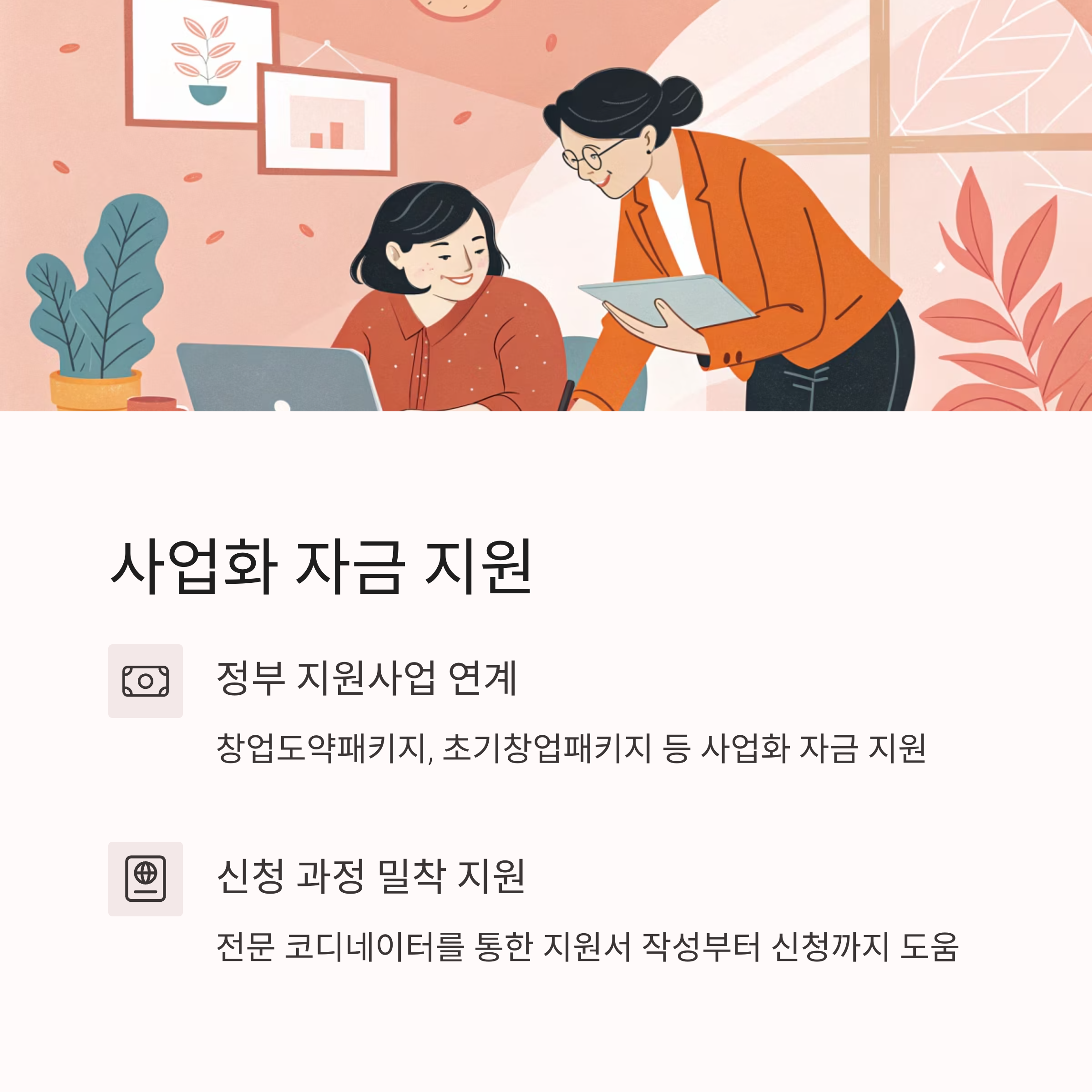 창업지원센터 내부의 매니저나 전문 코디네이터를 통해 지원서 작성부터 신청까지 밀착 지원을 받을 수 있습니다.