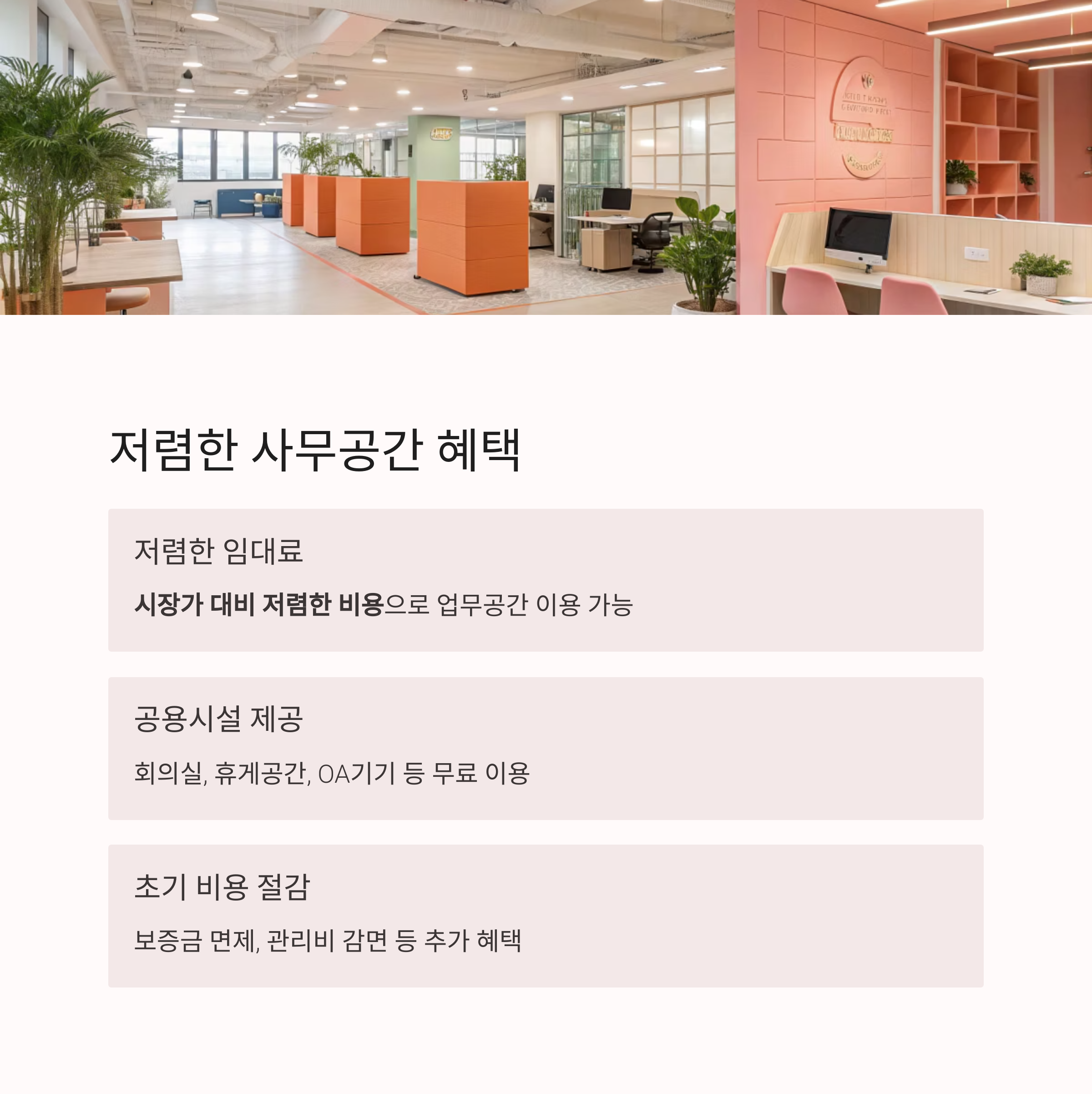 저렴한 비용의 사무공간 및 공용시설 제공