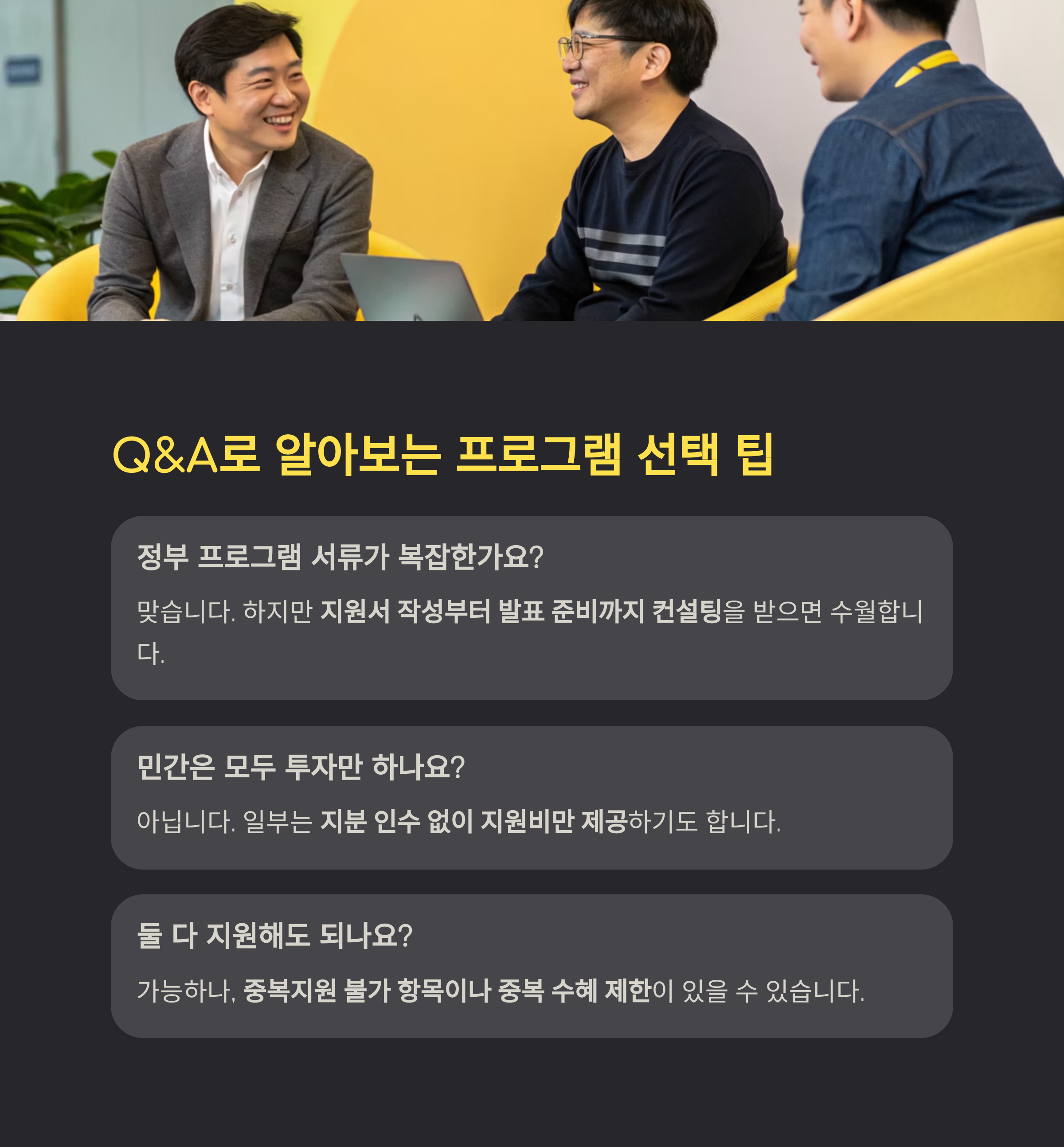 → 아닙니다. 일부는 지분 인수 없이 지원비만 제공하기도 하므로 세부 조건을 꼭 확인해야 합니다.