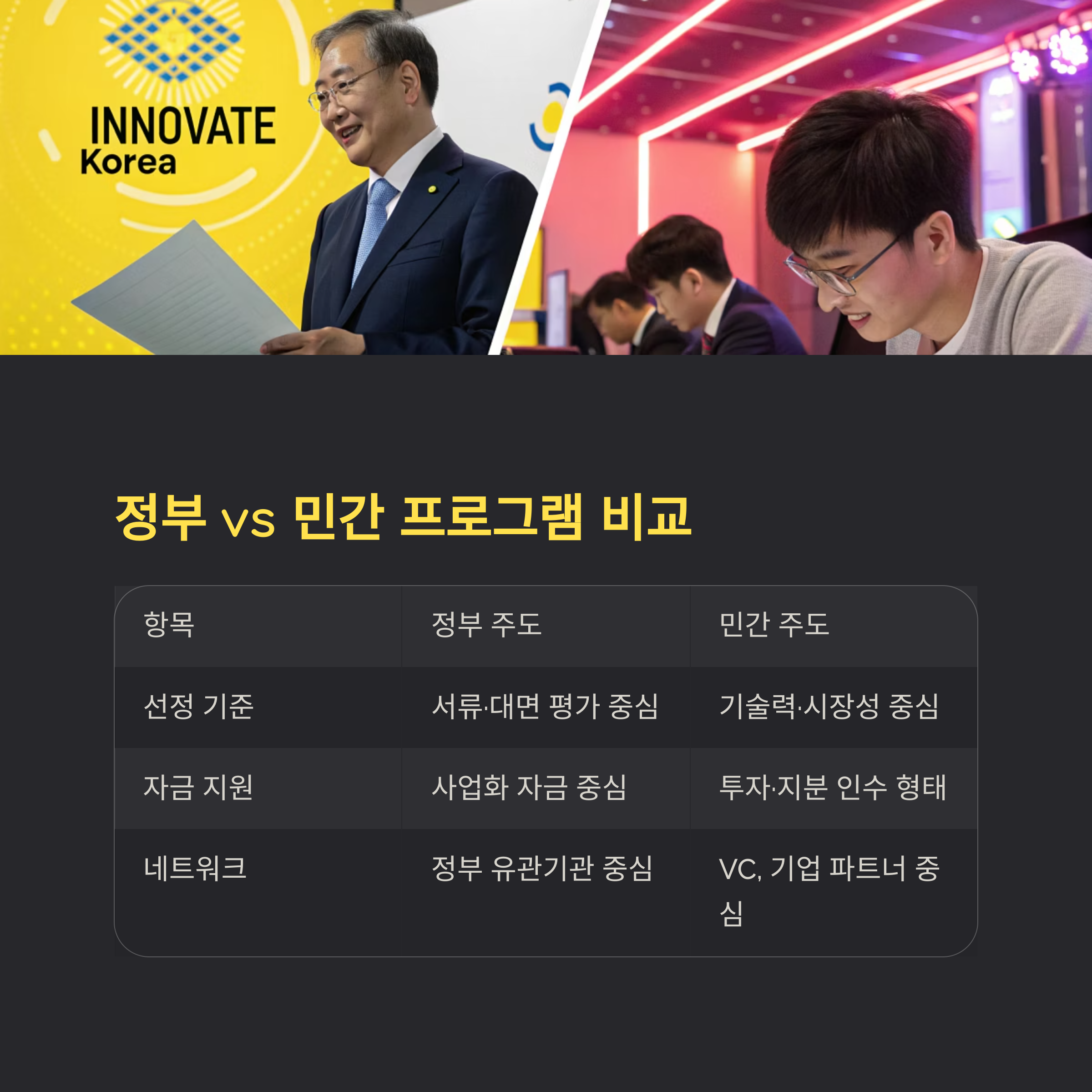 | 네트워크 | 정부 유관기관 중심 | VC, 기업 파트너 중심 |